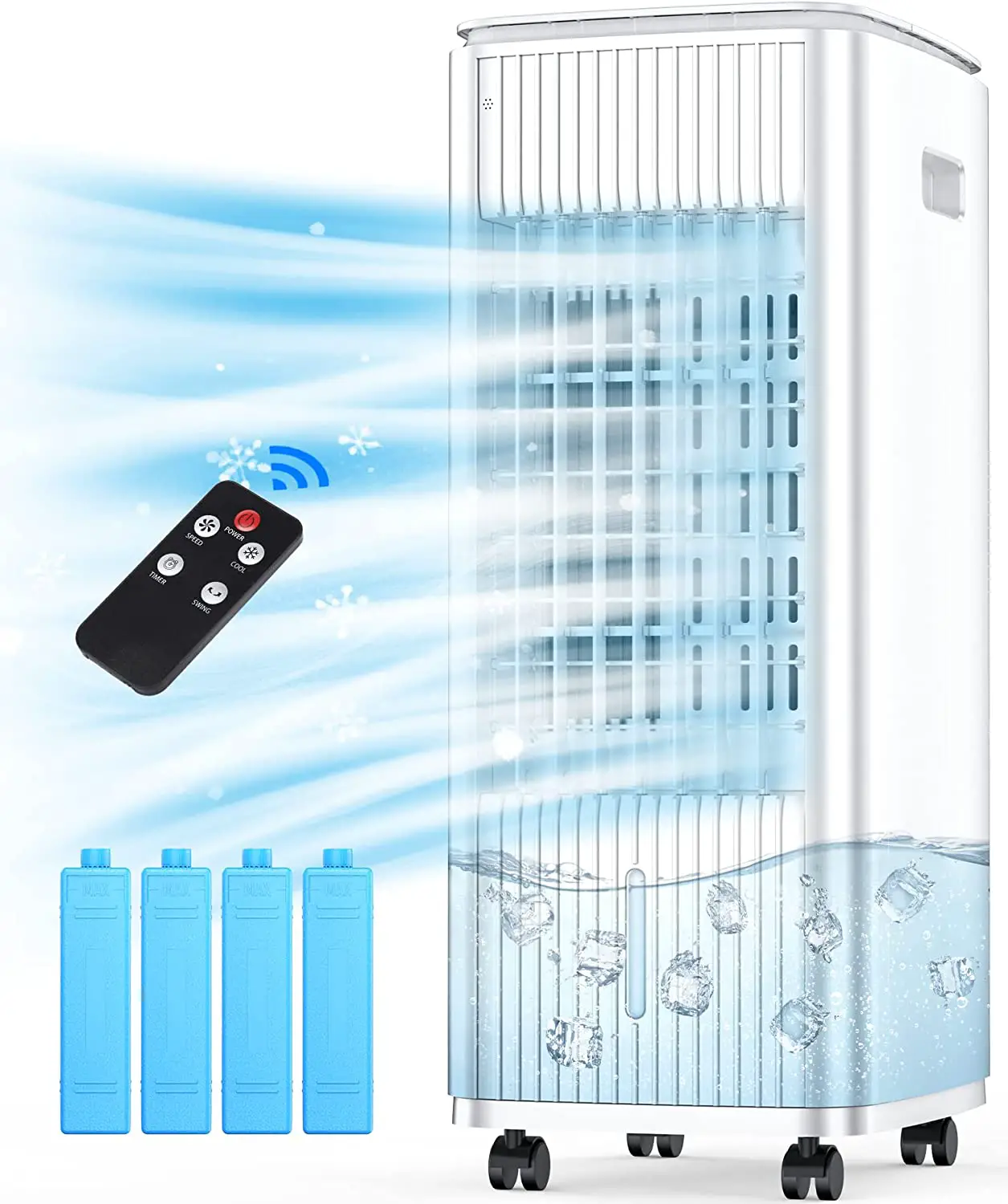 - Tanque de agua grande : Equipado con un tanque de agua de 8 galones, este enfriador garantiza un enfriamiento prolongado sin recargas frecuentes.