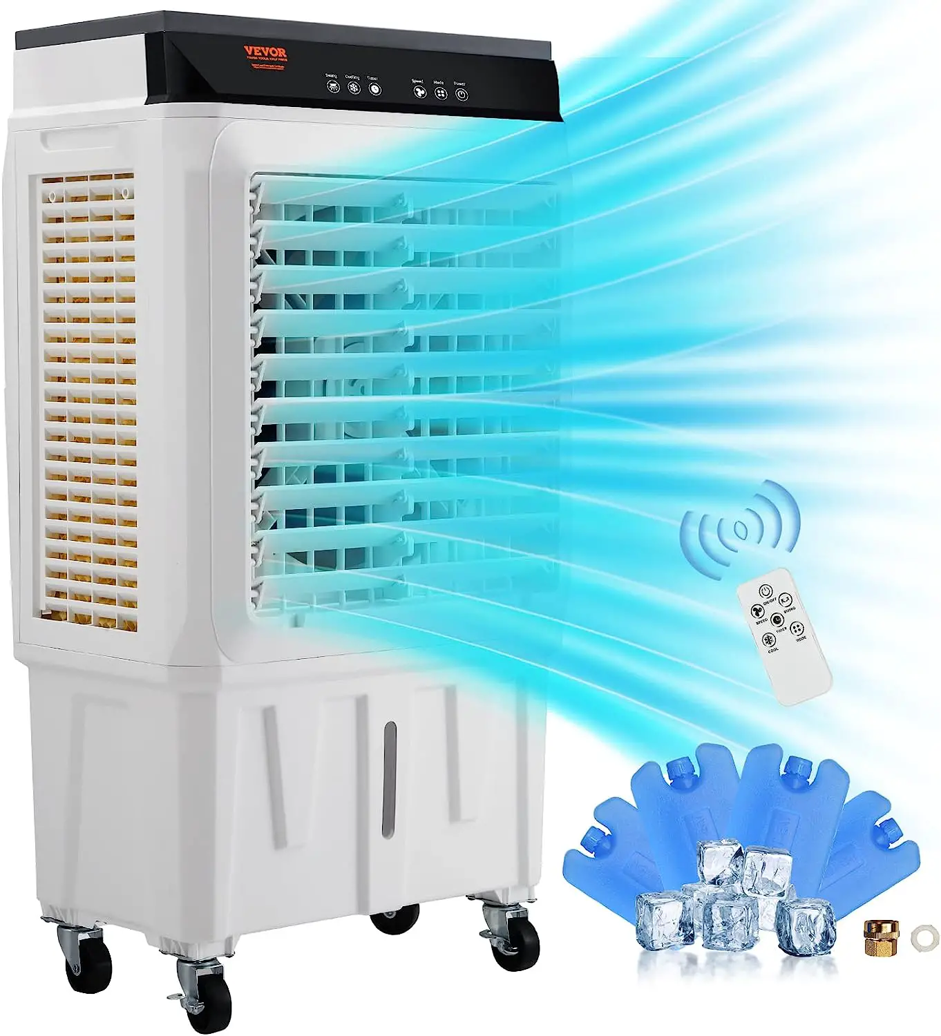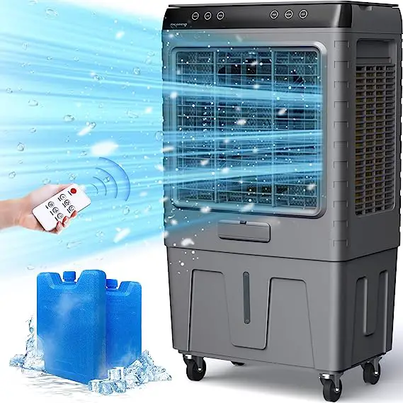 - Potente capacidad de enfriamiento : con una capacidad de flujo de aire de 5400 pies cúbicos por minuto, este enfriador de aire puede reducir significativamente la temperatura en su espacio. La sala de hielo incluida mejora el efecto refrescante.