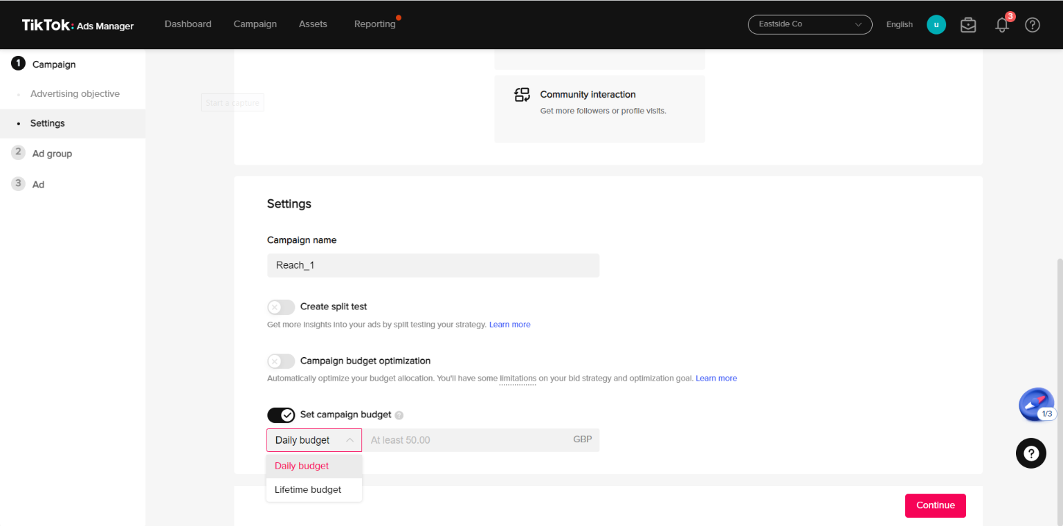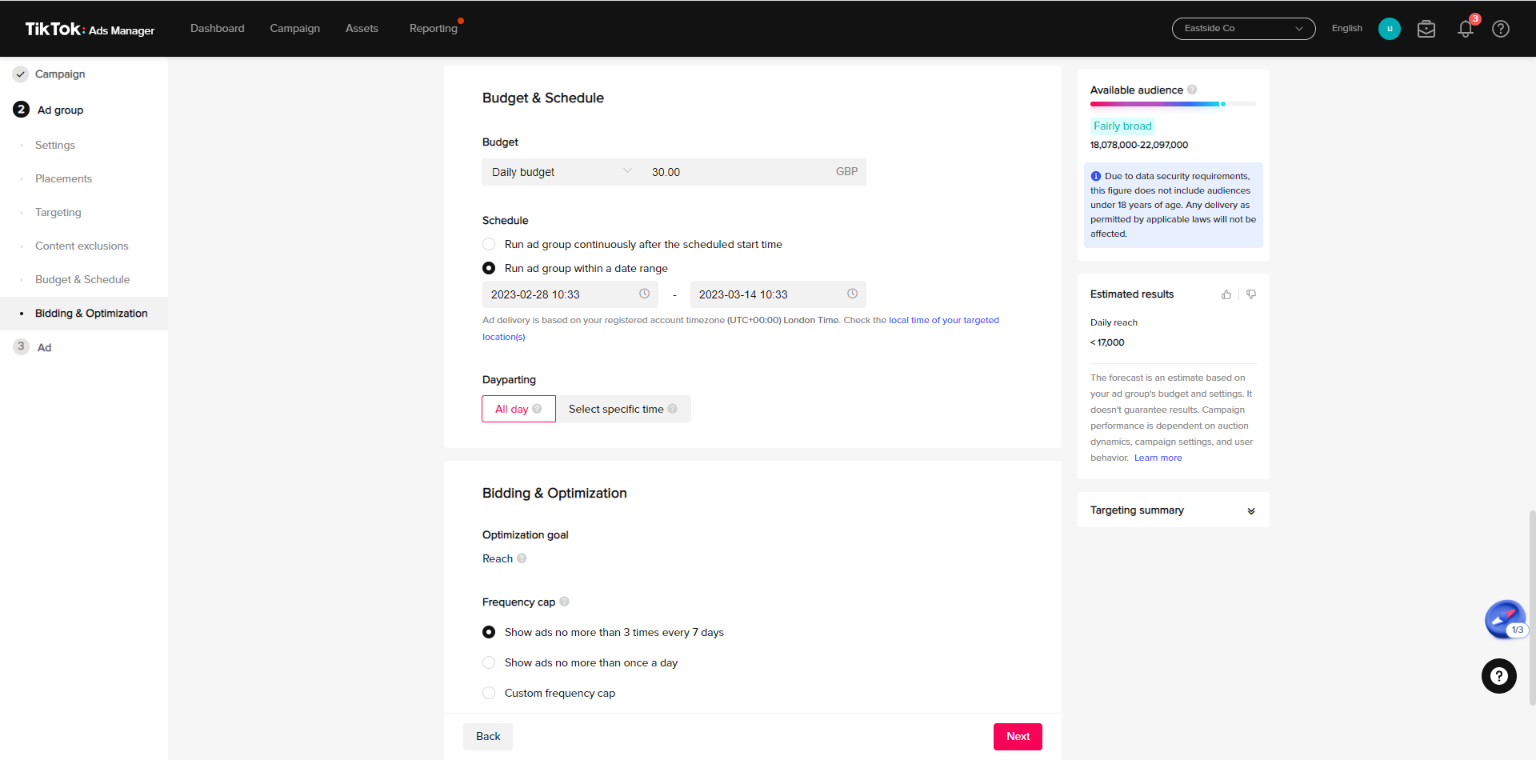 Cuando comience a comercializar en TikTok, normalmente tendrá que gastar alrededor de £ 50 por día o £ 20 por conjunto de anuncios si el presupuesto se establece en el nivel de conjunto de anuncios para garantizar la entrega continua de su campaña.