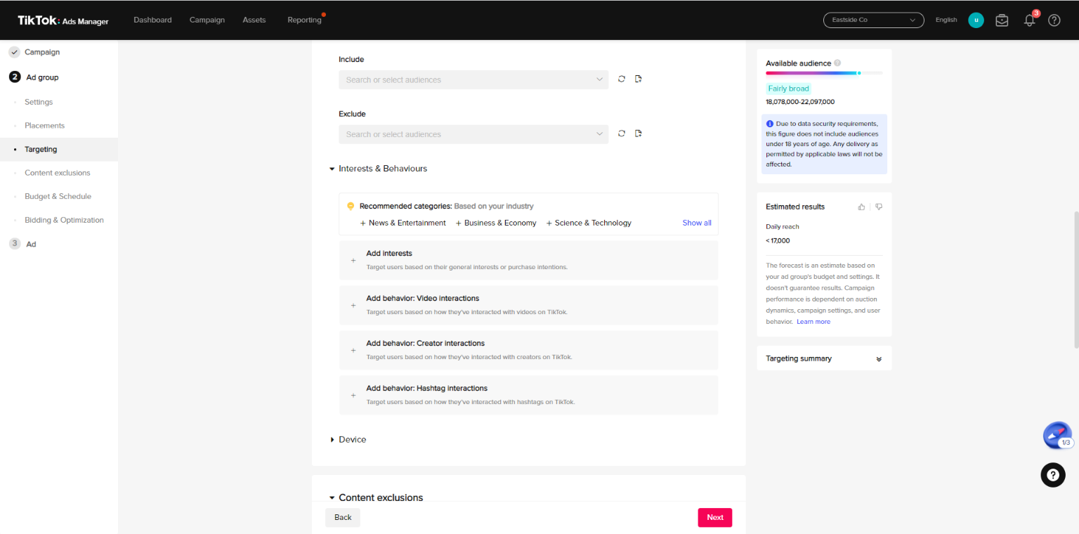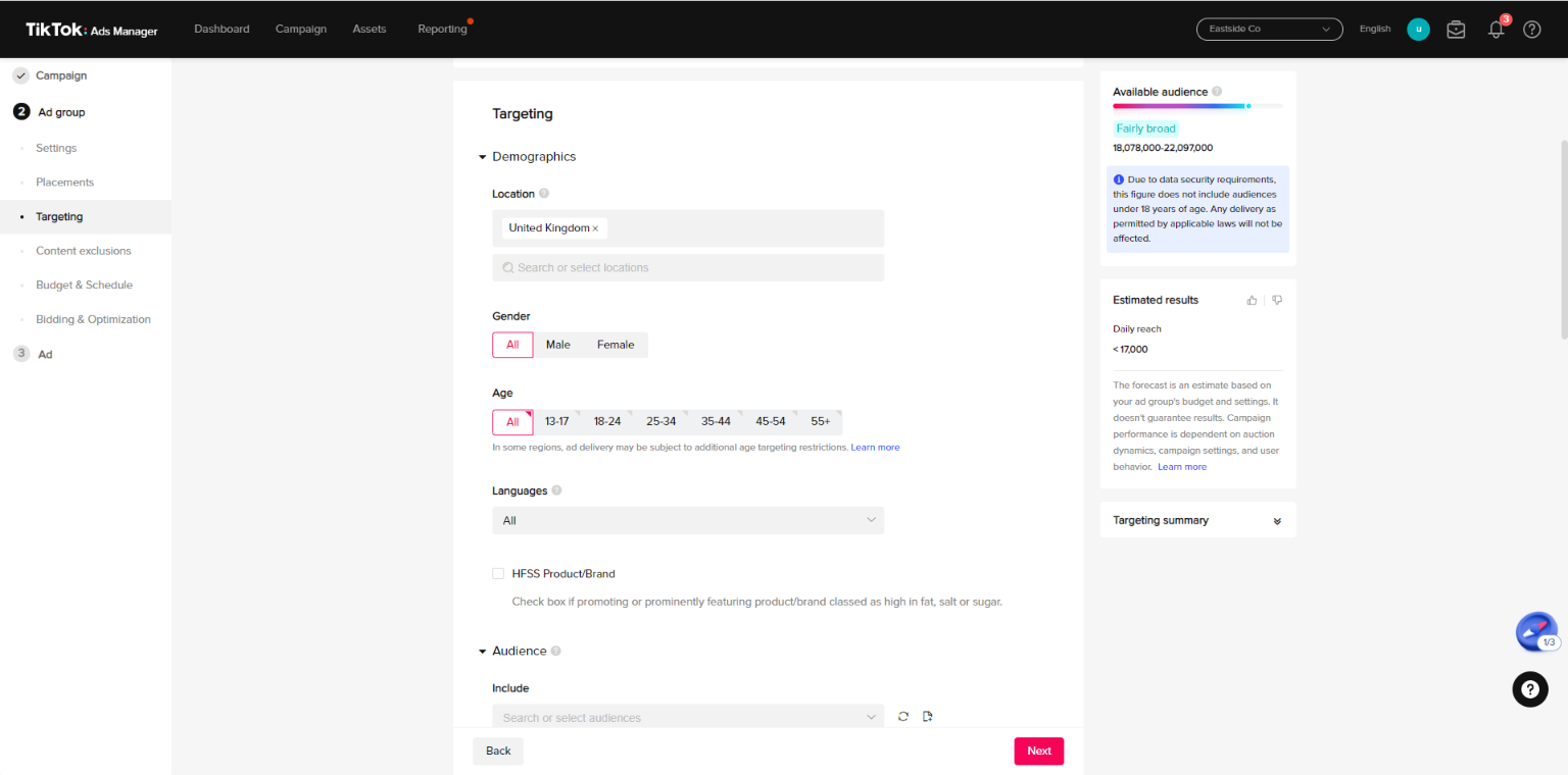 A continuación, asigne un nombre a su conjunto de anuncios y elija su audiencia. Puede seleccionar diferentes datos demográficos, como ubicación, sexo, edad, idiomas y, además; selecciona intereses, hashtags, comportamientos o creadores relevantes para tu marca.