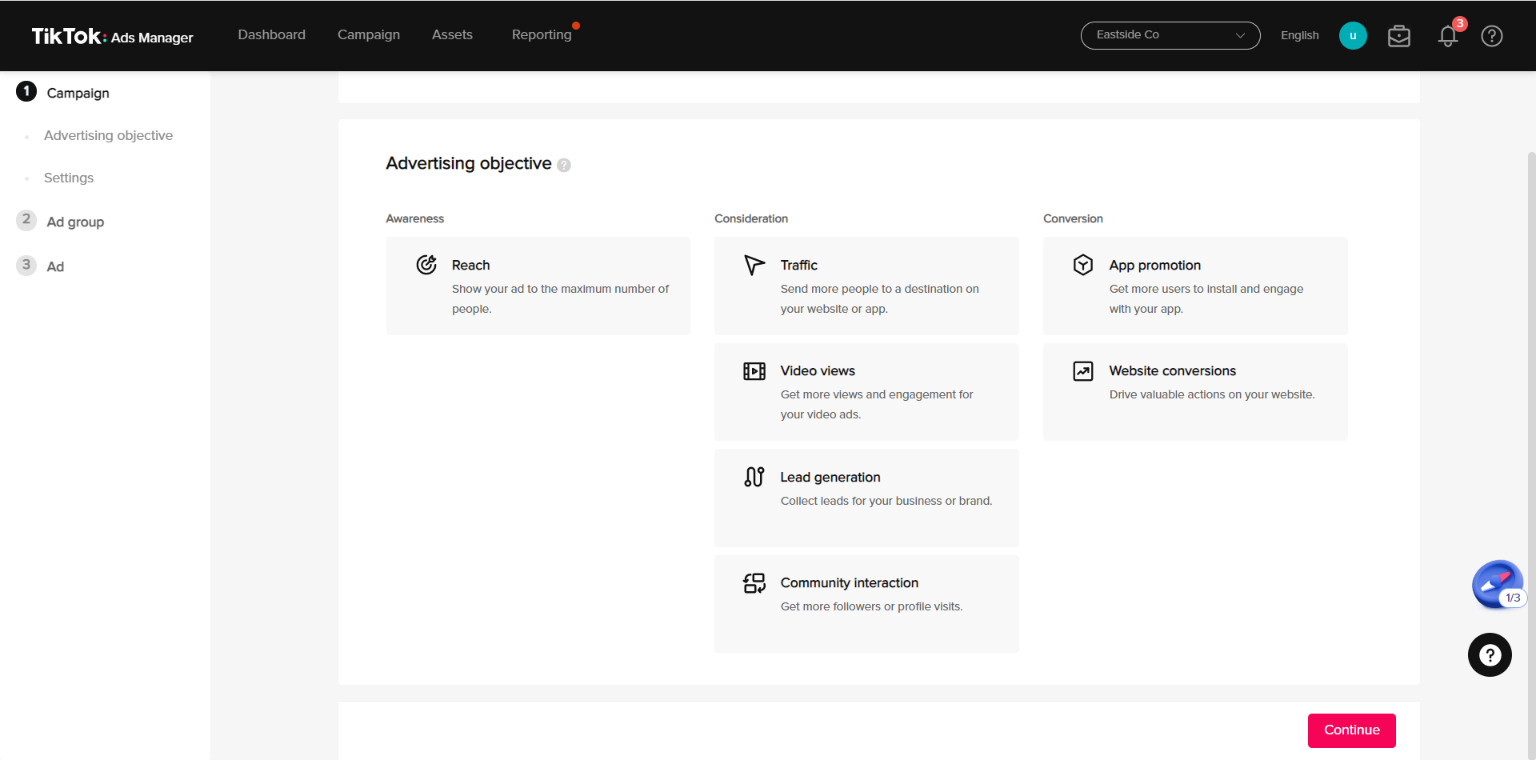 Teniendo eso en cuenta, hay varios objetivos de campaña diferentes que puede usar cuando anuncia en la plataforma. De manera similar a las plataformas Meta, los objetivos se clasifican en las categorías de Conciencia, Consideración y Conversión.