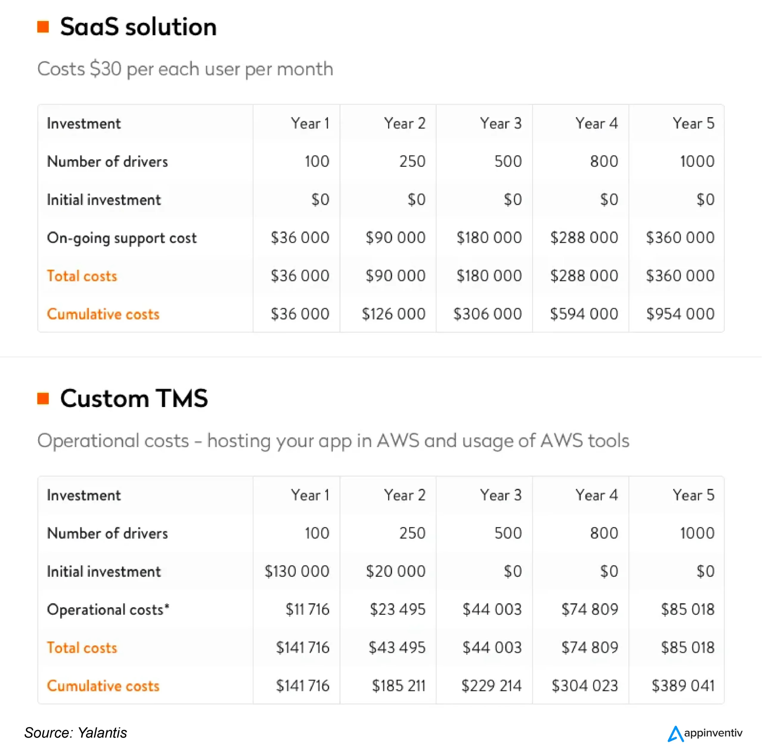 Después de esta llamada, realizamos una investigación interna sobre por qué, incluso ante la falta de funcionalidades, las empresas utilizan TMS de terceros. Lo que encontramos fue que citaron el costo como la razón principal. Ahora, independientemente de lo que le cueste hoy el desarrollo del sistema de gestión del transporte cuando lo compara con un gráfico de uso de 5 años, los resultados se verán así.