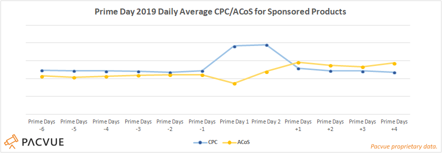 Una vez que haya establecido su presupuesto, haya identificado las palabras clave de cola larga y las que debe ganar, y haya elegido cómo asignar sus campañas, todavía hay más factores a considerar. Los eventos de ventas no son consistentes internamente; por ejemplo, los anunciantes que realizan ofertas agresivas pero no aumentan los presupuestos de sus campañas de manera adecuada para compensar el aumento de los gastos pueden llegar a su límite de presupuesto diario temprano en la mañana, lo que hace que los postores más conservadores se beneficien de un CPC y ACoS más bajos más tarde en el día. Prime Day 2019 mostró variaciones notables entre el primer y segundo día, particularmente en el aumento de ACoS mientras que el CPC se mantuvo relativamente estable. Nuestra interpretación de esto es que el entusiasmo de los compradores se atenuó durante el segundo día del evento, por lo que la misma inversión publicitaria generó un retorno menor en promedio.