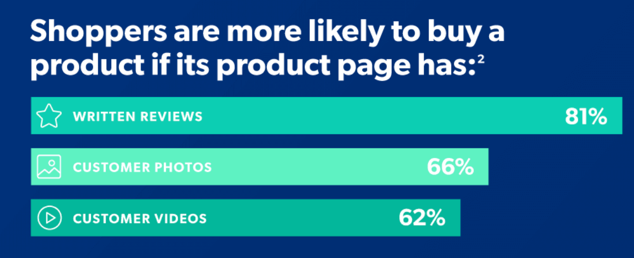 Según nuestro Índice de experiencia del comprador de 2021, casi el 40 % de los compradores no comprarán en páginas de productos sin UGC, y las páginas de productos son la fuente de aproximadamente la mitad de los compradores cuando buscan fotos de clientes. Las reseñas representan literalmente la voz del consumidor con sus propias palabras y son muy influyentes. Tanto es así que el 97% de los compradores afirman que las reseñas influyen en sus decisiones de compra y aquellos que interactúan con las reseñas tienen más del doble de probabilidades de convertirse que aquellos que no lo hacen.