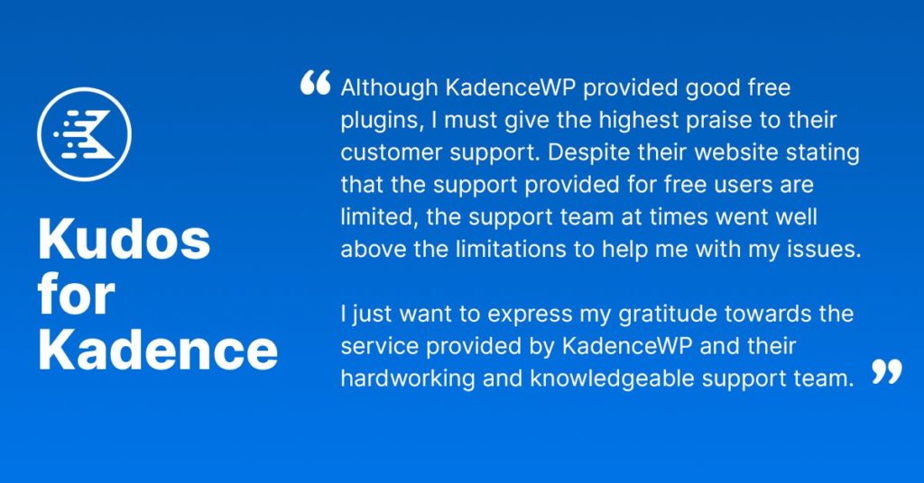 Chez Kadence, on tient à vous ! Cela nous donne tellement de joie de voir les utilisateurs de Kadence vivre leurs rêves, et nous voulons vous aider à le faire ! Notre équipe d'assistance vous rencontrera là où vous êtes et vous aidera à faire passer votre site Web au niveau supérieur. Mais ne vous contentez pas de nous croire sur parole…