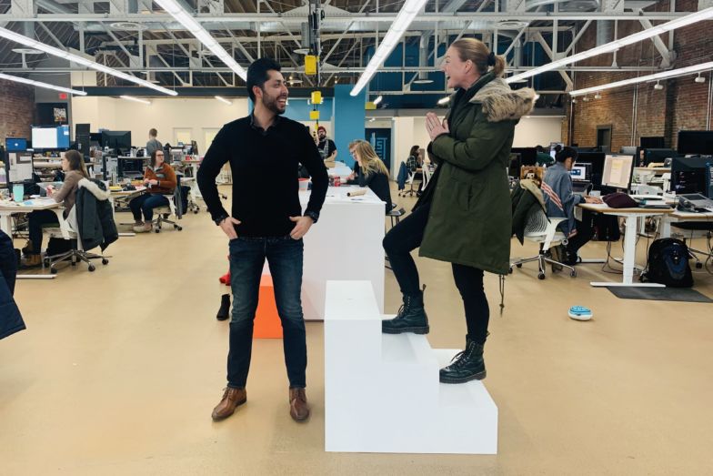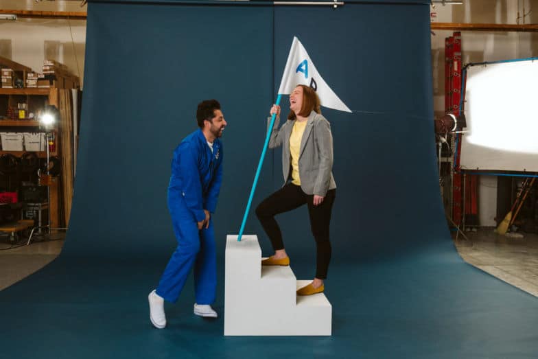 Une fois que nous avons décidé que les marches étaient le symbole de la croissance, nous avons obtenu un devis pour la production, utilisé notre imagination en espaçant la hauteur et la largeur dans le coin du bureau près de nos bureaux, et nous sommes même allés jouer la scène dans notre esprit ( comme le croquis) pour décider de la taille des marches. Nous voulions qu'ils se sentent naturels pour Nicole mais aussi bien photographier (ex: permettre un espacement confortable entre Alex et Nicole, rester propre pour permettre moins de travail Photoshop en post, etc.) Y a-t-il eu un moment où nous avons reçu des regards amusants de notre collègues pendant que nous jouions la scène dans les vrais escaliers près de leurs bureaux ? Tu paries!
