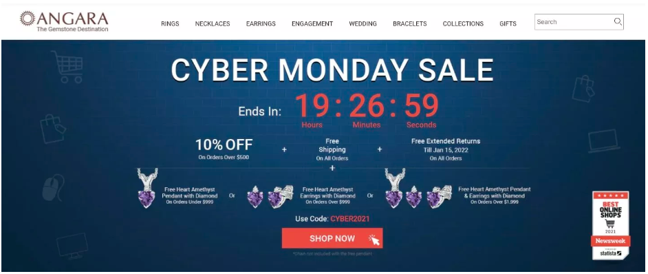 Se présentant comme «la destination des pierres précieuses», Angara propose plus de 7 000 produits de joaillerie allant des boucles d'oreilles, des colliers et des bagues de fiançailles.