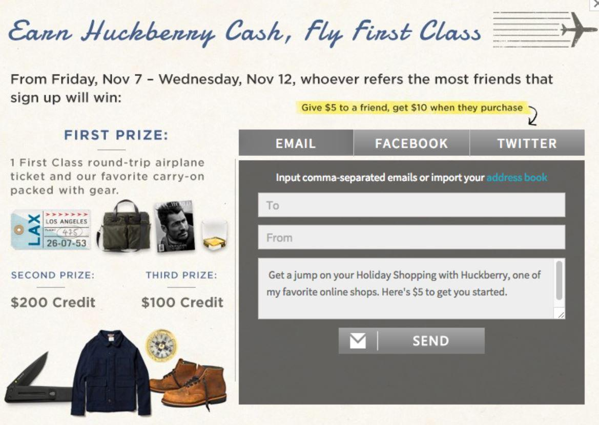 Le concours du détaillant en ligne Huckberry a encouragé les participants à recommander leur marque en échange d'un crédit de 10 $ lors de l'achat. Pour renforcer la motivation, ils ont également offert des billets d'avion aller-retour et des bagages à main avec du matériel emballé aux gagnants du premier prix.