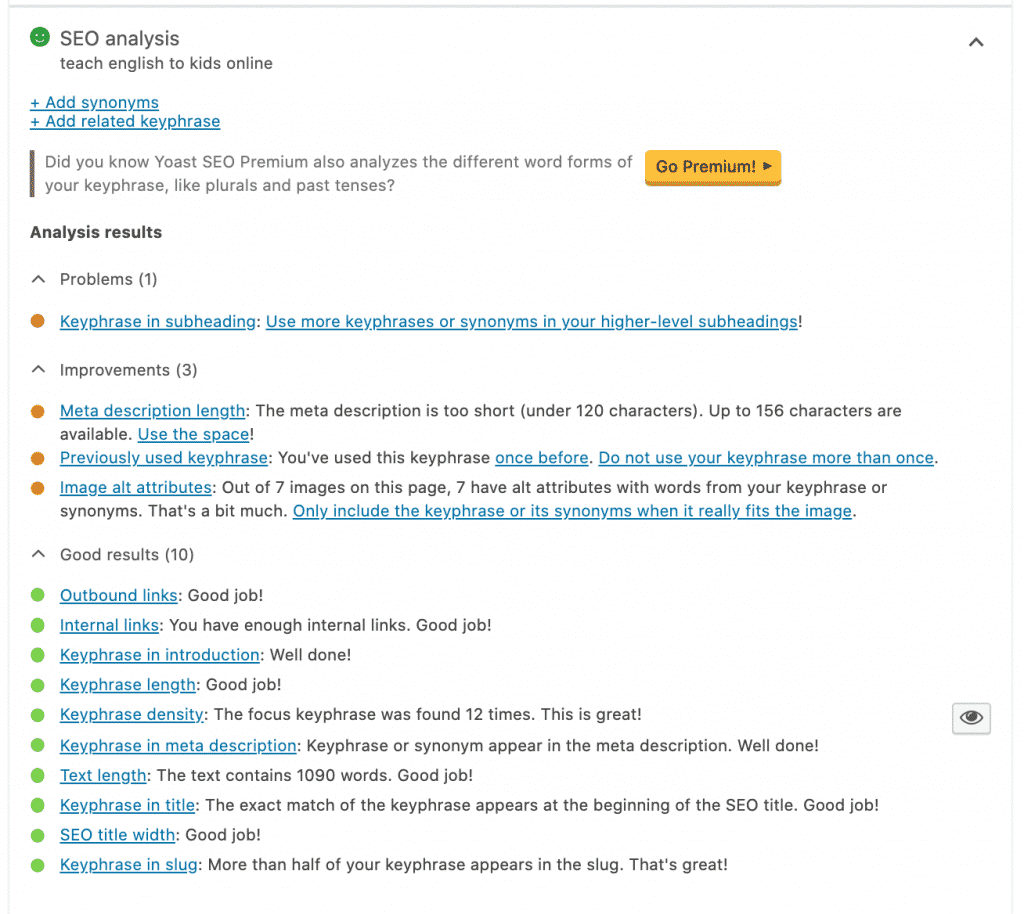 Essayez d'utiliser le plugin Yoast pour une analyse de contenu en temps réel sur WordPress. Vous pouvez vérifier vos articles afin de les optimiser pour Google avant de les publier.