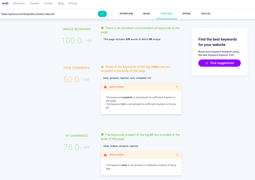 Une fois les pages en ligne, analysez le référencement du contenu et le référencement technique avec SEO Tester Online. Vous pouvez voir les performances globales de chaque page Web et comment améliorer le contenu.