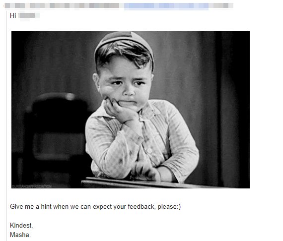 Par exemple, Maria Sereda, brand and community manager chez Serpstat, estime que l'e-mail de suivi doit être court et accrocheur et cela donne des résultats : "En attente d'une réponse de l'éditeur depuis plusieurs jours, je lui ai envoyé un e-mail avec le GIF en attente et j'ai reçu une réponse en 5 minutes.