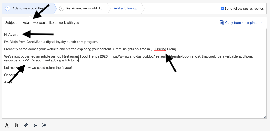 Vous avez besoin d'un excellent modèle d'e-mail pour votre sensibilisation. Créer un e-mail de sensibilisation engageant demande de la pratique. Même lorsque vous savez ce que vous faites, vous devez créer quelques variantes d'un modèle et les tester séparément, car certains messages généreront un taux de réponse plus élevé.