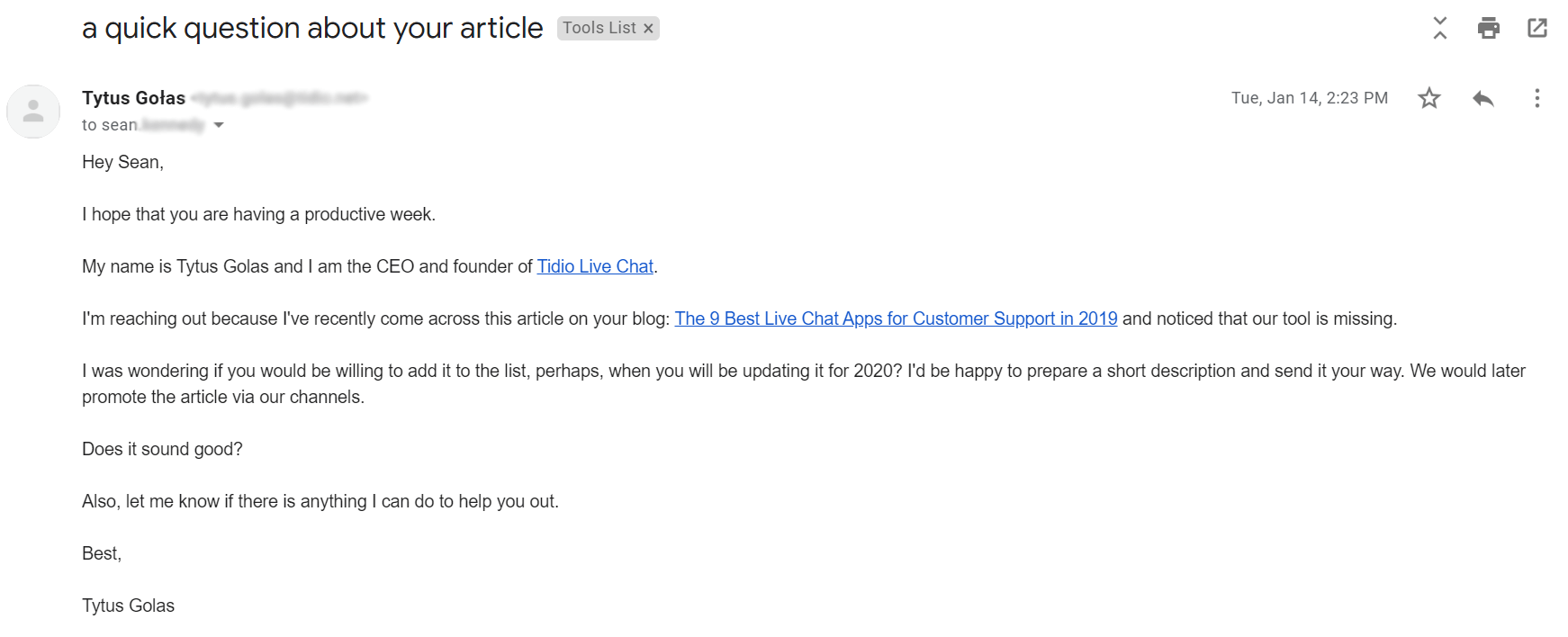 Mais si vous n'avez pas le temps ou l'envie d'établir une connexion avant d'envoyer votre e-mail de sensibilisation, vous devez quand même faire des recherches. Par exemple, Tytus Golas, fondateur de Tidio Live Chat, suggère de rechercher des messages de liste pertinents. Lorsque vous contactez une personne avec une question directe, vous avez plus de chances d'obtenir une réponse positive :