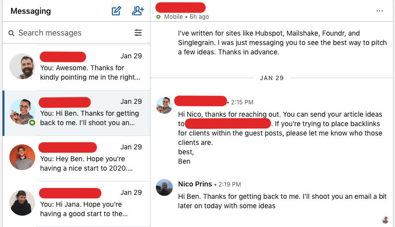 "Je trouve que LinkedIn est l'un des canaux de communication les plus efficaces pour les sites à forte DR/DA. Vous pouvez facilement trouver et vous connecter avec les éditeurs pertinents. De plus, comme les gens reçoivent moins d'arguments sur LinkedIn, vous avez plus de chances d'obtenir une réponse à votre requête. »