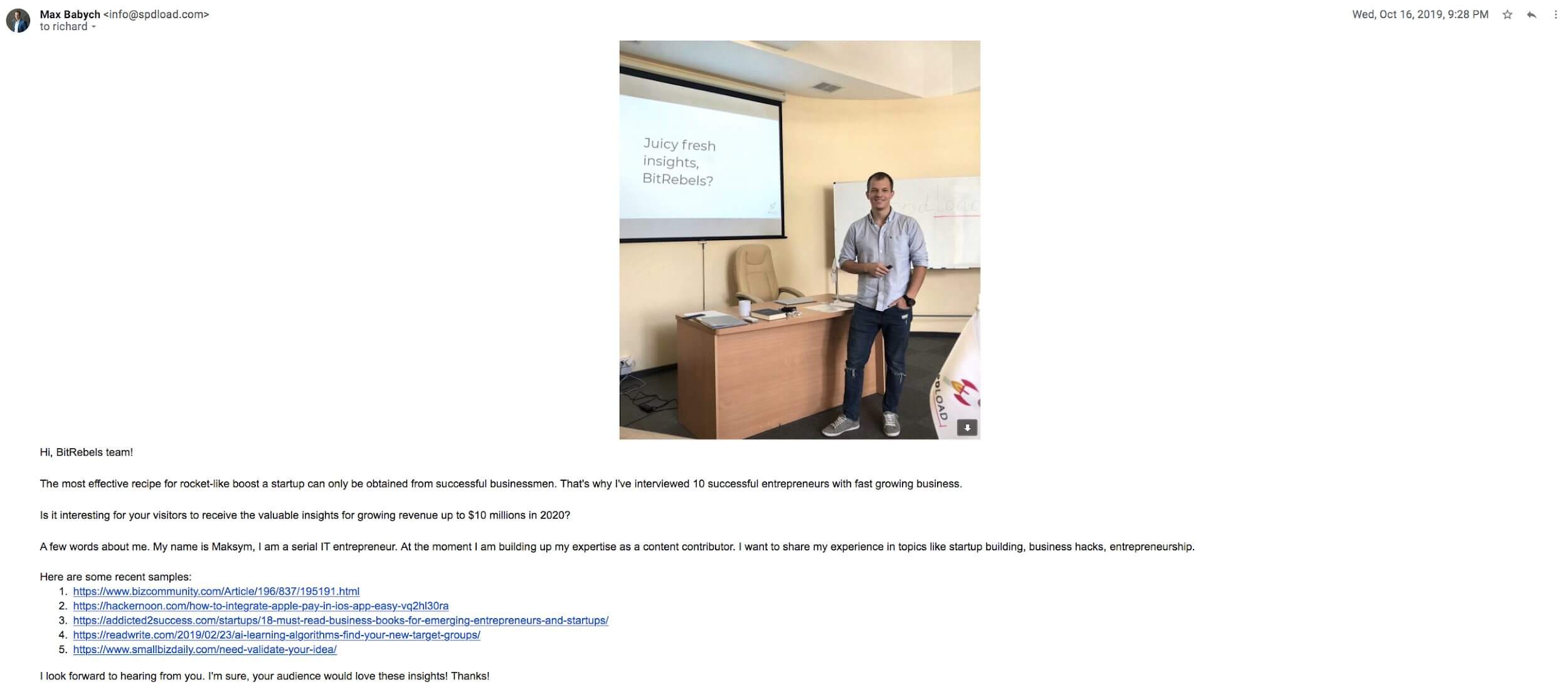Puisque 65 % des gens sont des apprenants visuels, vous pouvez également utiliser des images pour personnaliser vos e-mails, et Maksym Babych, PDG de SpdLoad, croit au pouvoir de cette tactique :