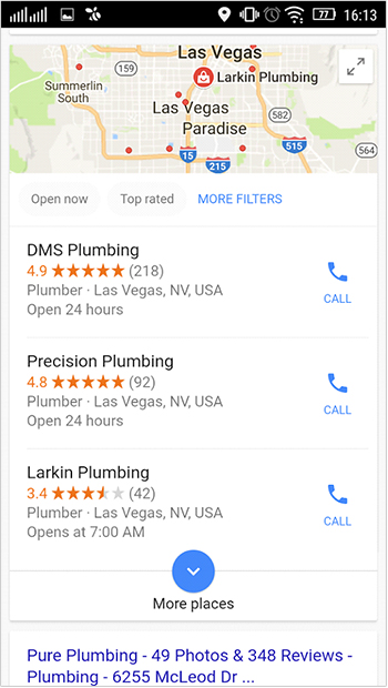 Les résultats locaux sur mobile affichent également trois entreprises, les mêmes que la version de bureau. Les plus grandes différences sont la carte plus petite, ce qui signifie que Google montre les plombiers plus près de l'emplacement de l'utilisateur qu'avec une recherche sur ordinateur, et les entreprises affichent un bouton d'appel en un clic. Il s'agit d'informations glanées sur Google My Business, vous devez donc vous assurer d'afficher et d'inclure autant d'informations que possible sur cette page Web.