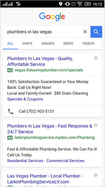 Sur mobile, la section des résultats payants fonctionne à peu près de la même manière que sur ordinateur. Google décide des annonces qui apparaissent en fonction des trois facteurs ci-dessus. Lorsque vous choisissez de diffuser une annonce, la publicité sera diffusée par défaut sur ordinateur et mobile. Cependant, vous avez la possibilité de le faire fonctionner uniquement sur des appareils mobiles. L'un des avantages de la diffusion d'annonces uniquement sur mobile est que la copie de l'annonce peut être écrite pour cibler spécifiquement les personnes utilisant des téléphones. Lorsque votre entreprise diffuse une annonce pour mobile, il est judicieux d'ajouter des extensions d'annonce, ce qui signifie que les internautes peuvent cliquer pour appeler et cliquer pour obtenir un itinéraire. Faciliter la localisation ou le contact avec votre entreprise peut entraîner une augmentation spectaculaire des taux de conversion. Ces types d'extensions d'annonces n'entraînent pas de coût supplémentaire et vous ne payez que lorsqu'un internaute clique sur l'extension, comme pour le reste de l'annonce textuelle. Activez les extensions d'annonces en vous connectant à votre compte en trouvant l'onglet intitulé "Extensions d'annonces".
