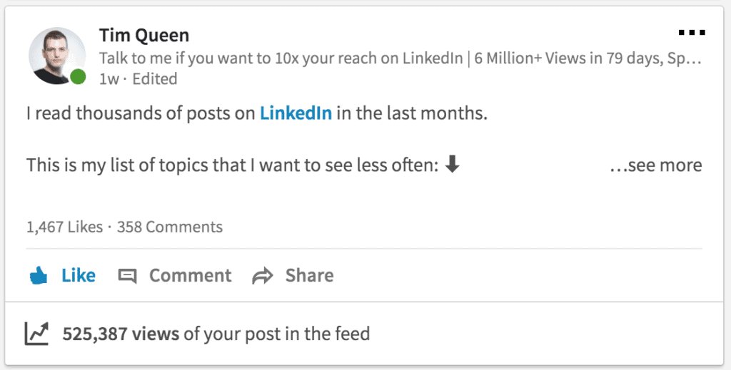 Les publications textuelles ont été le premier type de contenu natif fortement priorisé par l'algorithme de fil d'actualité de LinkedIn. Cela a forcé les créateurs de contenu à écrire des mini-histoires captivantes dans un espace de 1 300 caractères.