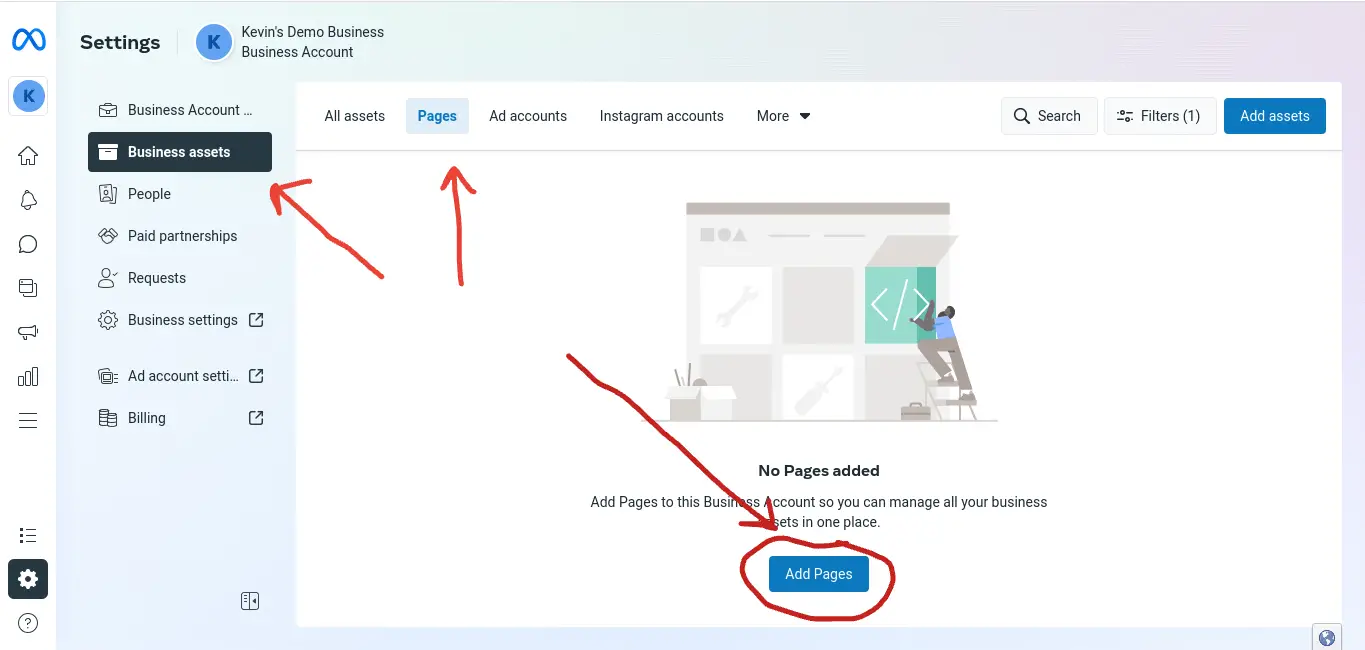 Cliquez sur "Business Assets" puis sur "Pages" et cliquez sur "Ajouter des pages".