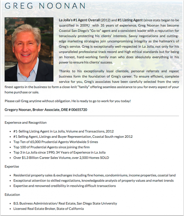 " Agent n°1 des ventes de La Jolla Homes dans l'ensemble - et agent inscripteur n°1 de La Jolla* Greg Noonan vous donne les meilleures chances de réussir sur ce marché compliqué avec des sous-communautés dont la valeur varie considérablement.