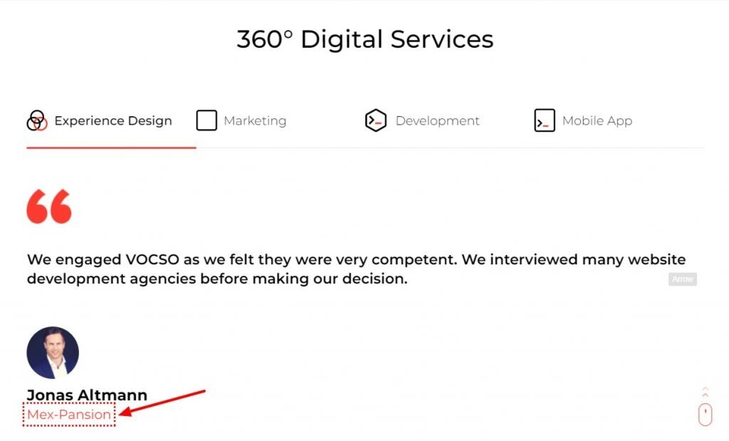 Les témoignages peuvent également être utilisés comme outil de marketing. Non seulement pour remplir l'espace avec quelques images - photos de profil client - ou pour établir l'autorité, mais aussi pour améliorer le référencement. Si vous partagez vos témoignages, il est également possible de créer un lien vers votre site Web. La plupart des entreprises sur le site Web ont un lien avec des témoignages et en donnant vos témoignages, vous pouvez générer un lien retour pour votre site Web. Voyez comment l'un des clients de VOCSO obtient un lien de retour pour son site Web en donnant ses précieux commentaires sur notre travail.