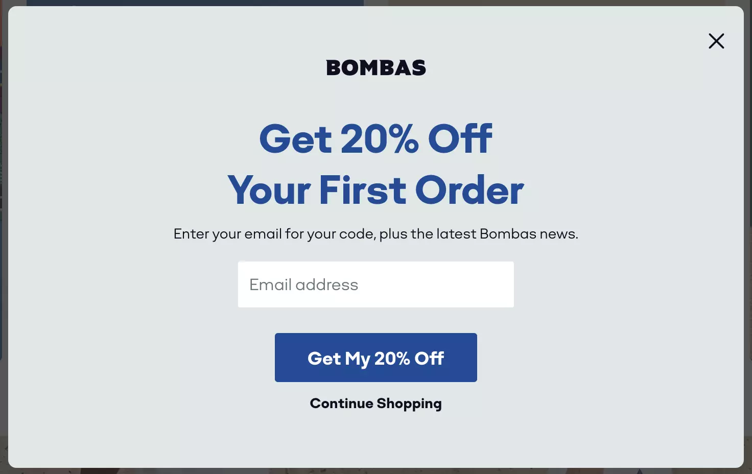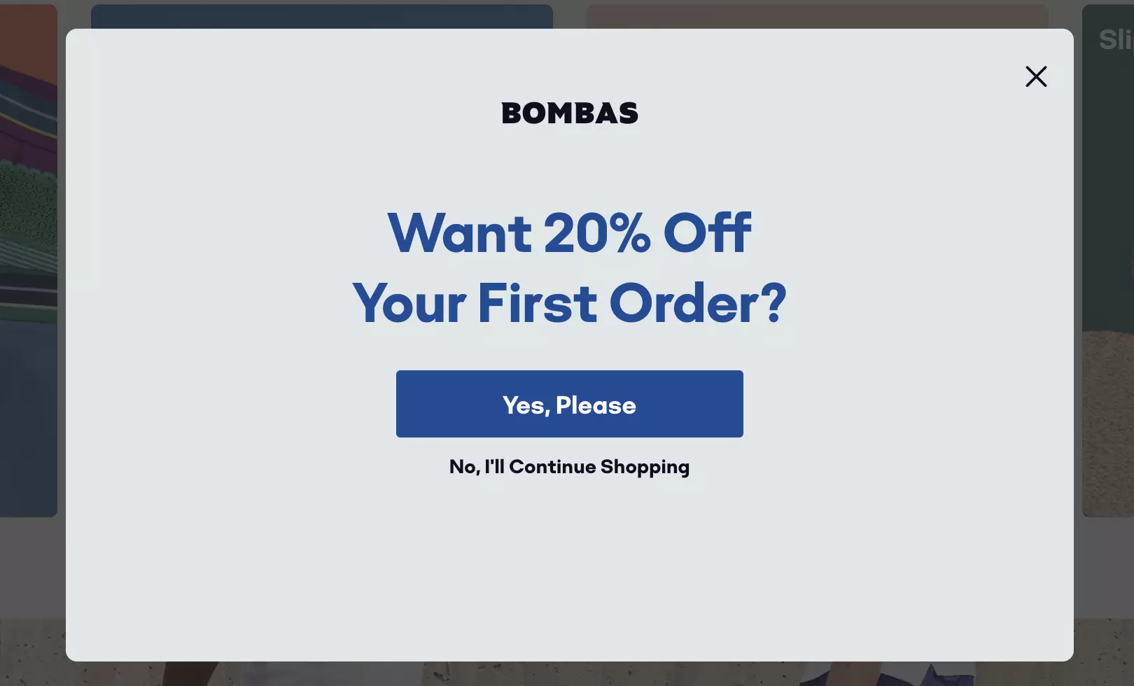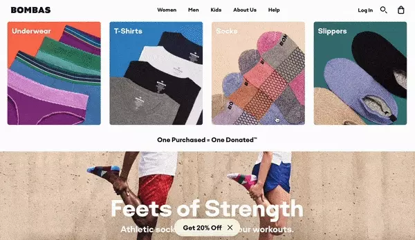 Cette fois, il vient de Bombas, l'un des meilleurs magasins Shopify. Au lieu du cadeau de produit, la marque offre une remise de 20 %.
