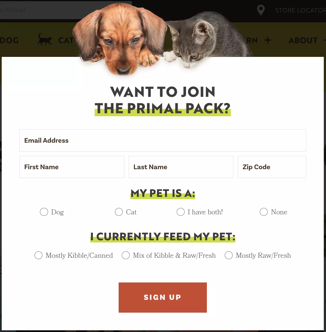 Notez également la quantité d'informations demandées par cet exemple de formulaire d'inscription. Outre l'e-mail, Primal Pet Foods demande le nom, le code postal et les informations relatives aux animaux de compagnie de l'abonné.