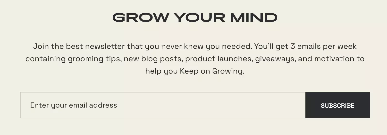 L'une des missions de la marque est d'aider les clients à faire pousser de superbes barbes. Le formulaire d'inscription à la newsletter soutient cette mission en fournissant du matériel pour développer leurs compétences, ou «esprit».