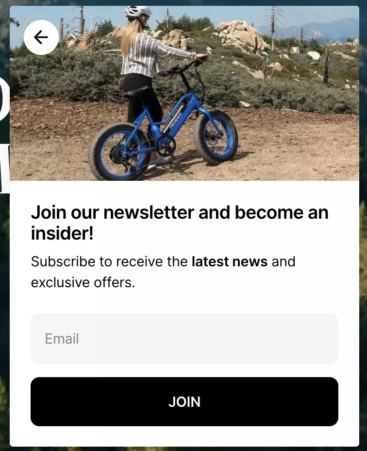 De cette façon, Pedego donne des messages marketing importants plus rapidement (et en un seul endroit !). Par exemple, la marque peut partager des remises, générer du trafic vers d'autres pages et, bien sûr, générer des prospects.