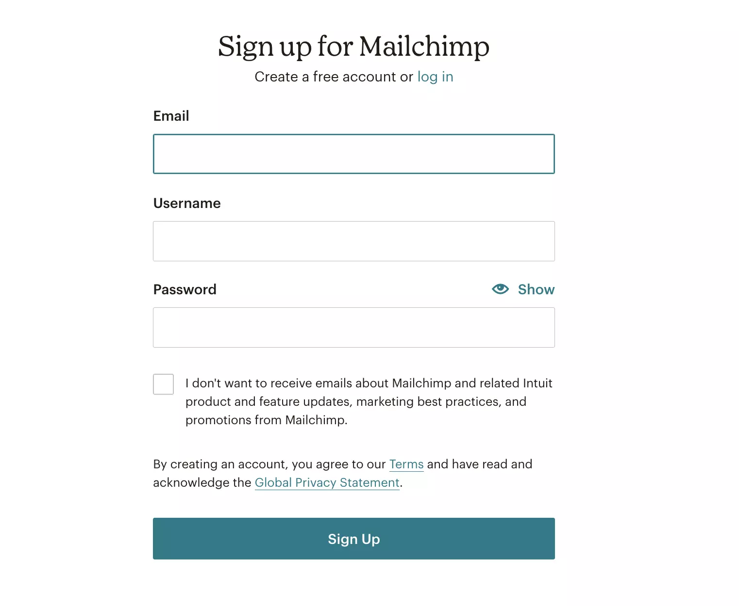 Il provient de MailChimp, une application de marketing par e-mail populaire. Lorsque vous créez un compte sur leur site Web, vous êtes présenté avec ce formulaire d'inscription ci-dessous. C'est propre, facile à remplir et très simpliste.