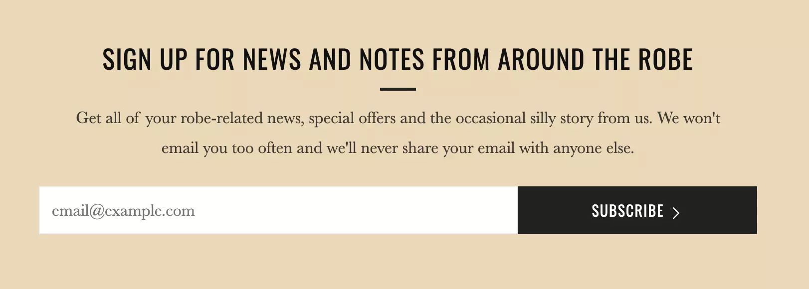 Cet exemple de formulaire d'inscription élégant est une bonne source d'inspiration pour les magasins en ligne avec un blog. Outre un excellent design, le formulaire répertorie de nombreuses raisons de s'abonner : une remise, un contenu utile et des "surprises amusantes pour la communauté".