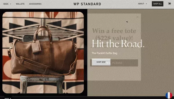 Au lieu d'afficher le popup tout de suite, la marque affiche un petit teaser dans le coin inférieur droit du site. Le teaser pose une question intrigante : "Gagnez un sac ?"