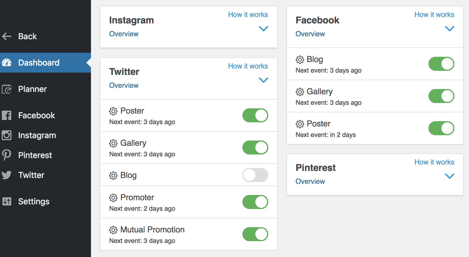 En gros, ça fonctionnait avec 4 grands réseaux sociaux ; Instagram, Pinterest, Twitter et Facebook. Ainsi, en fonction du paramètre que vous choisissez, il peut effectuer l'une des opérations suivantes :