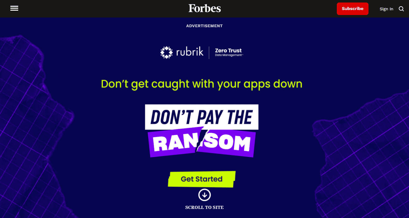 Forbes a magnifiquement exprimé en quelques mots de quoi il s'agit et a ajouté un CTA clair pour que les utilisateurs puissent commencer. La page comporte également un bouton "faire défiler vers le site" qui fait disparaître l'annonce comme si le site réel était en dessous.