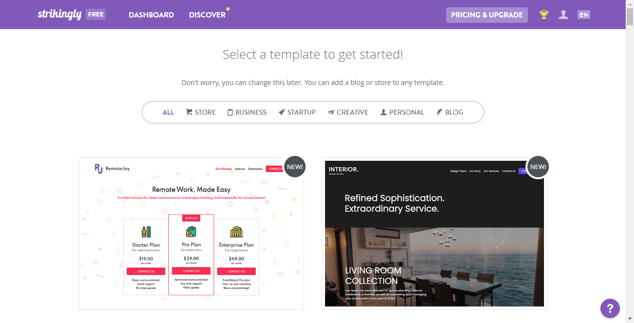 Strikingly héberge une bibliothèque de fonctionnalités et de modèles de création de pages que vous pouvez modifier sans aucune compétence en matière de codage ou de programmation, ce qui en fait l'outil le plus simple pour créer des pages de démarrage.