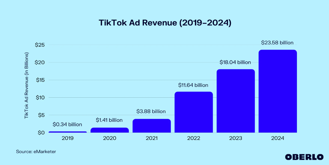 Mais il n'y a pas que les consommateurs. Les revenus publicitaires de TikTok en 2021 étaient de 3,88 milliards de dollars, augmentant de façon exponentielle pour atteindre 11,64 milliards de dollars en 2022. Donc, d'autres annonceurs saturent déjà tous la plateforme ? Pas assez. Les dépenses publicitaires prévues pour TikTok pour 2023 sont de 18,04 milliards de dollars en 2023, pour atteindre 23,58 milliards de dollars en 2024.