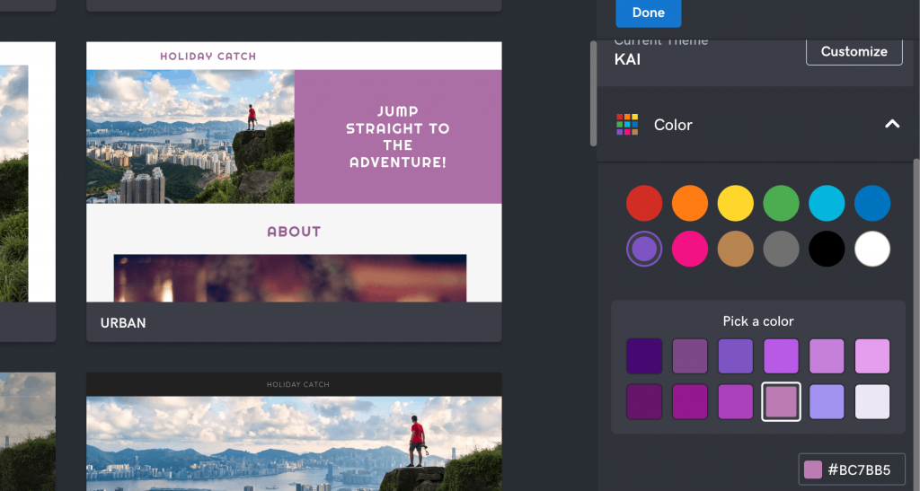 L'éditeur de GoDaddy est également relativement simple. Cela ne fonctionne pas avec le glisser-déposer comme Wix, mais vous pouvez personnaliser les éléments de votre site à partir du panneau latéral. Vous pouvez changer le "thème" de votre site (qui est identique à un modèle) et modifier des éléments de base comme le texte, les images et les boutons.