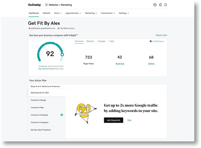 GoDaddy établit le GoCentral (package de commerce électronique GoDaddy), qui est une combinaison des services de création de sites Web et d'hébergement de GoDaddy, désormais appelés Sites Web + Marketing . GoDaddy InSight™ est un système d'apprentissage intelligent qui fournit des données et des conseils en fonction de votre secteur d'activité et de vos objectifs. C'est un guide pour passer du temps sur les tâches qui auront le plus d'impact sur votre entreprise. Ensuite, pour suivre les données de performance, ils fournissent également Insight Score - comparant votre entreprise à d'autres dans votre secteur et votre région, avec un marchand similaire.
