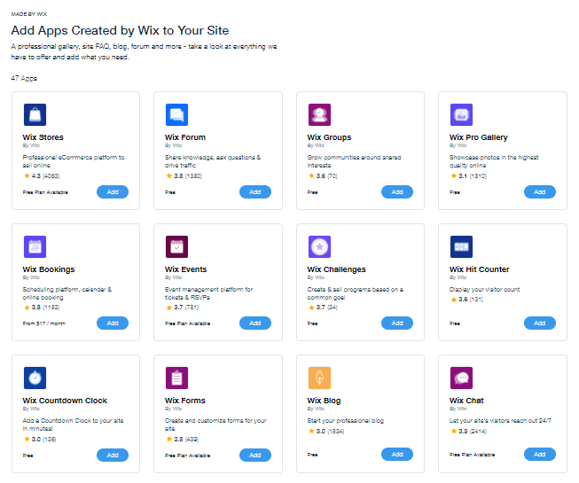 Wix possède un App Market avec plus de 300 applications créées par Wix et des tiers. Les applications sont réparties en catégories basées sur le contenu et sur le commerce électronique. La plupart des applications sont gratuites ou ont une version allégée. D'autres exigent des paiements mensuels et varient en prix. Malgré une collection limitée d'applications, elles couvrent les fonctionnalités les plus demandées.