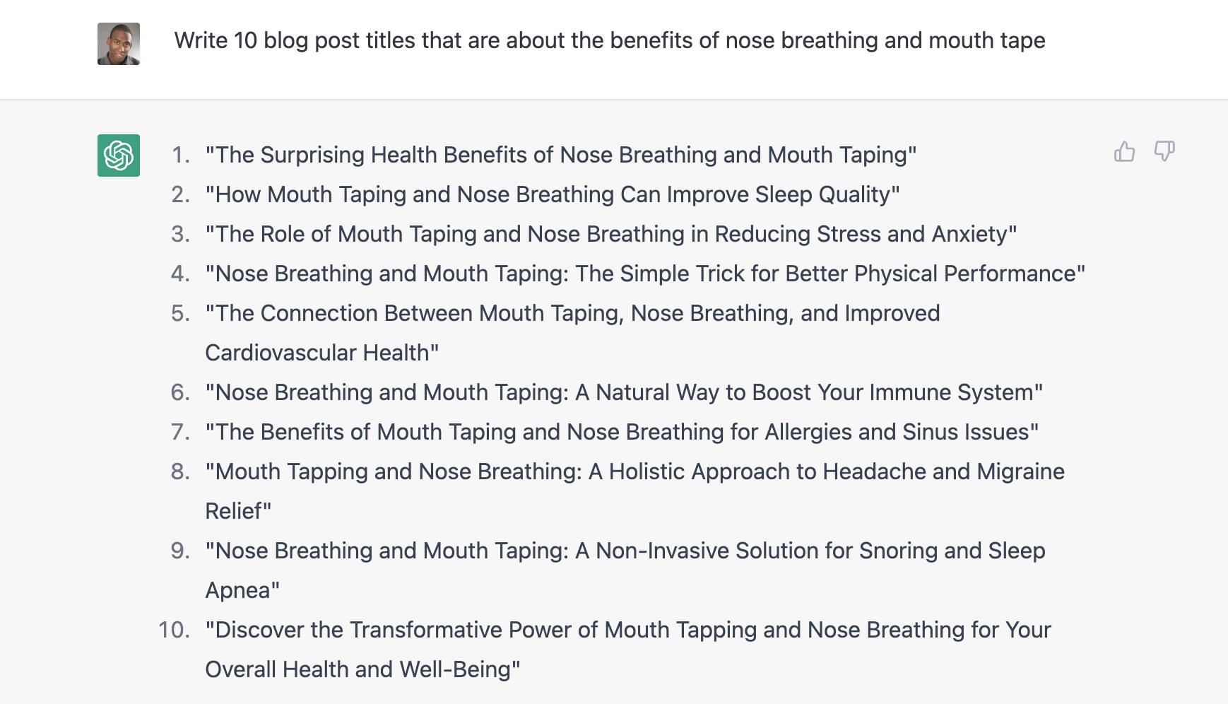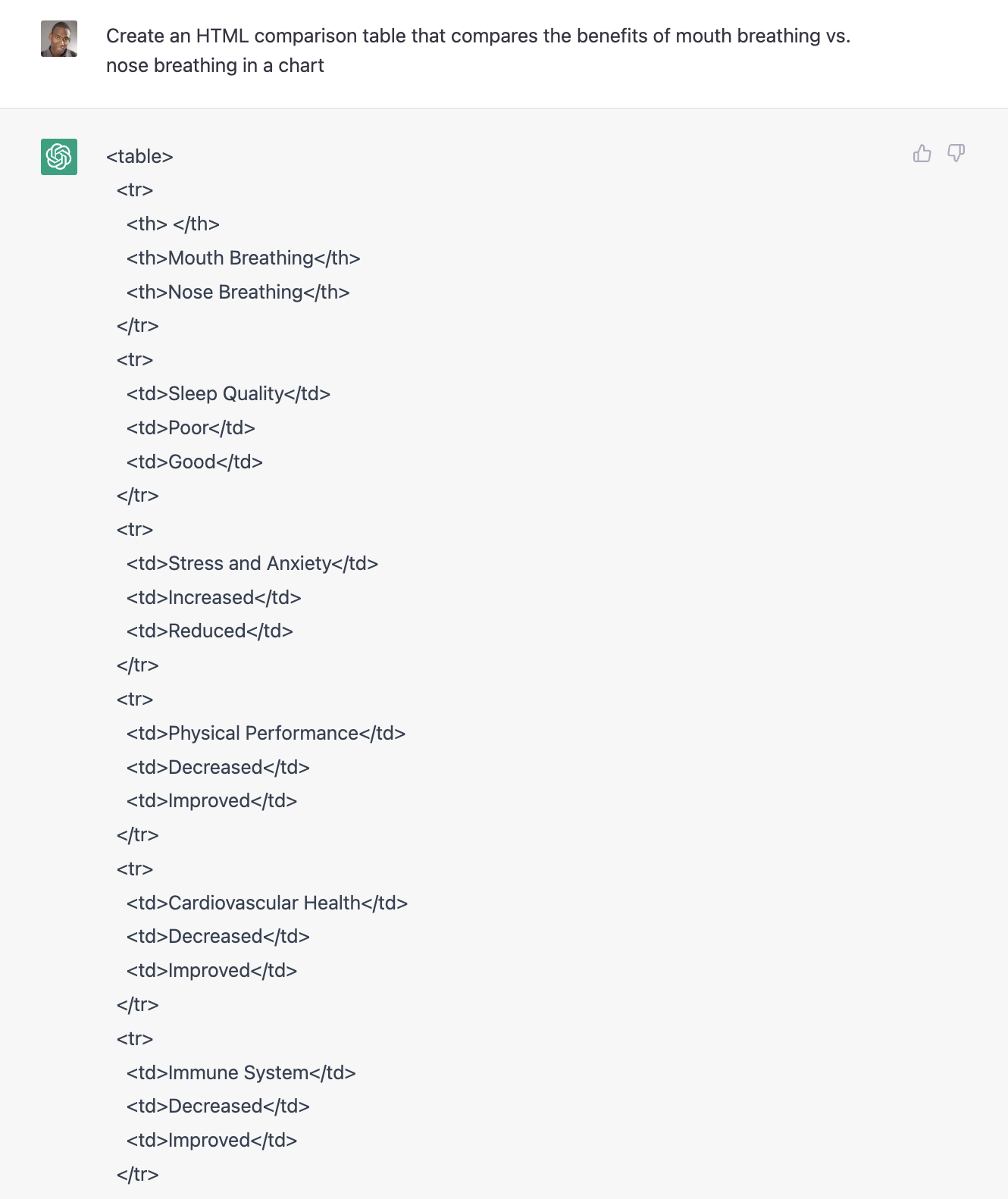 Dan pada subjek posting blog, tugas umum pembuat konten adalah menulis HTML untuk meningkatkan posting blog. Memanfaatkan ChatGPT, Anda dapat meminta layanan untuk mengembangkan HTML atas nama Anda. Misalnya, Anda dapat meminta ChatGPT untuk mengembangkan bagan yang membandingkan pernapasan mulut dan pernapasan hidung.