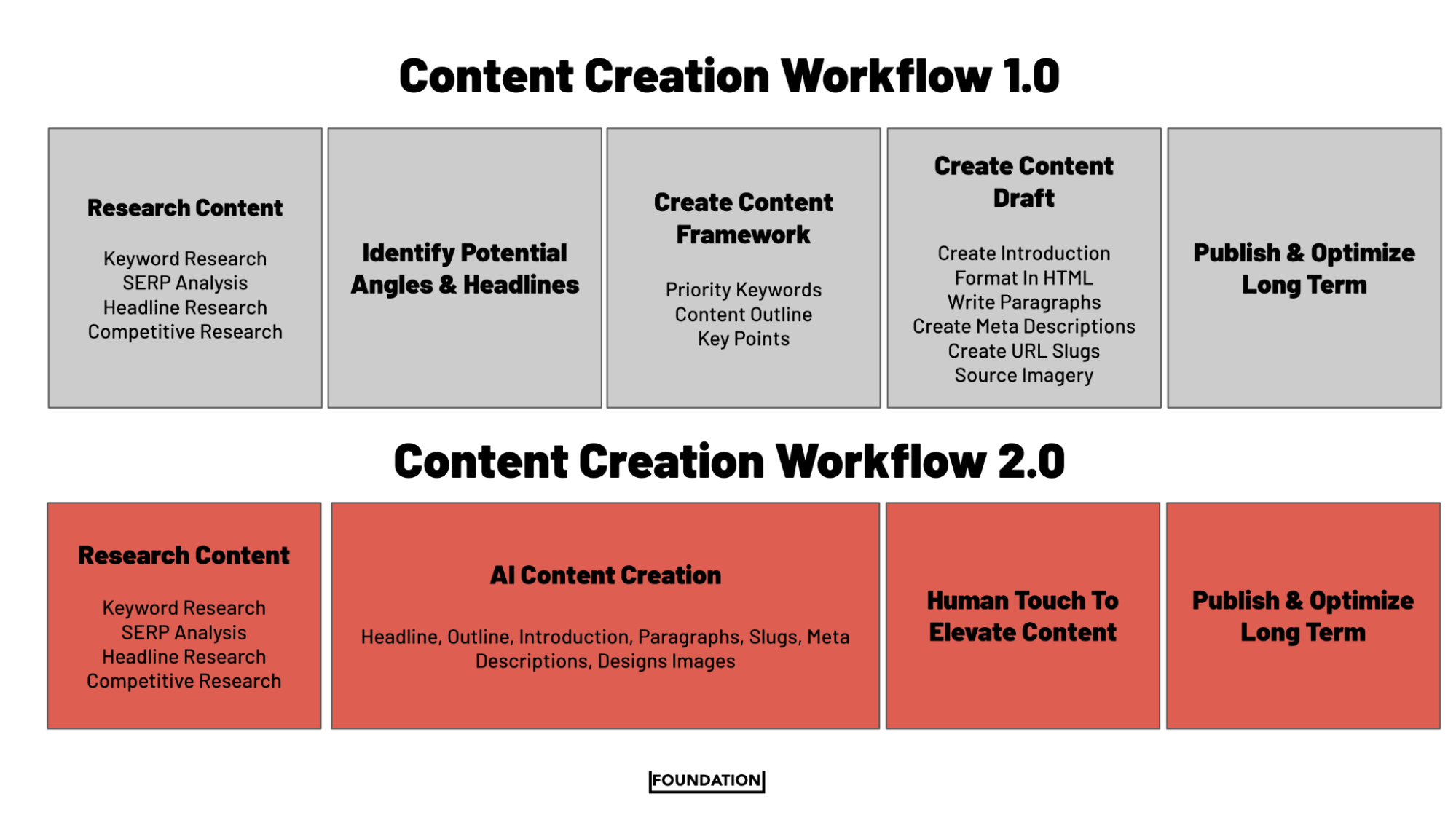 Alur kerja pembuatan konten sebelum AI vs alur kerja pembuatan konten menggunakan AI dapat diringkas dalam grafik berikut: