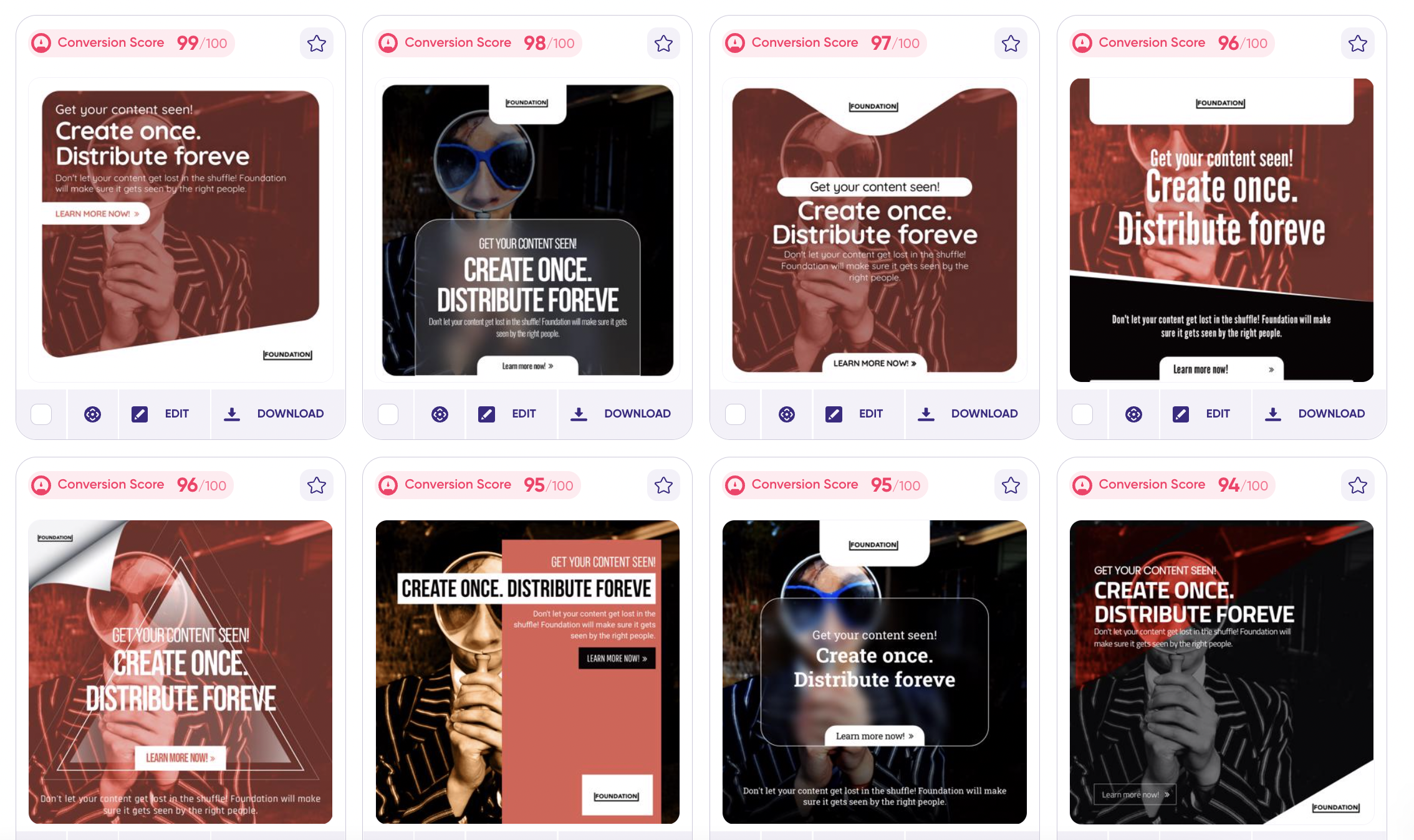 Pembuatan iklan digital adalah tugas yang hanya membutuhkan beberapa detik untuk AI, sementara manusia sering membutuhkan waktu berhari-hari untuk melakukan pekerjaan yang sama. Sebagai contoh lain, saya sekarang dapat masuk ke alat seperti AdCreative.ai dan menceritakan sedikit tentang Foundation. Dalam waktu kurang dari 10 menit, saya dapat menggunakan alat ini untuk memberi saya 90+ variasi iklan yang dapat digunakan di LinkedIn, Facebook, Google, dan lainnya: