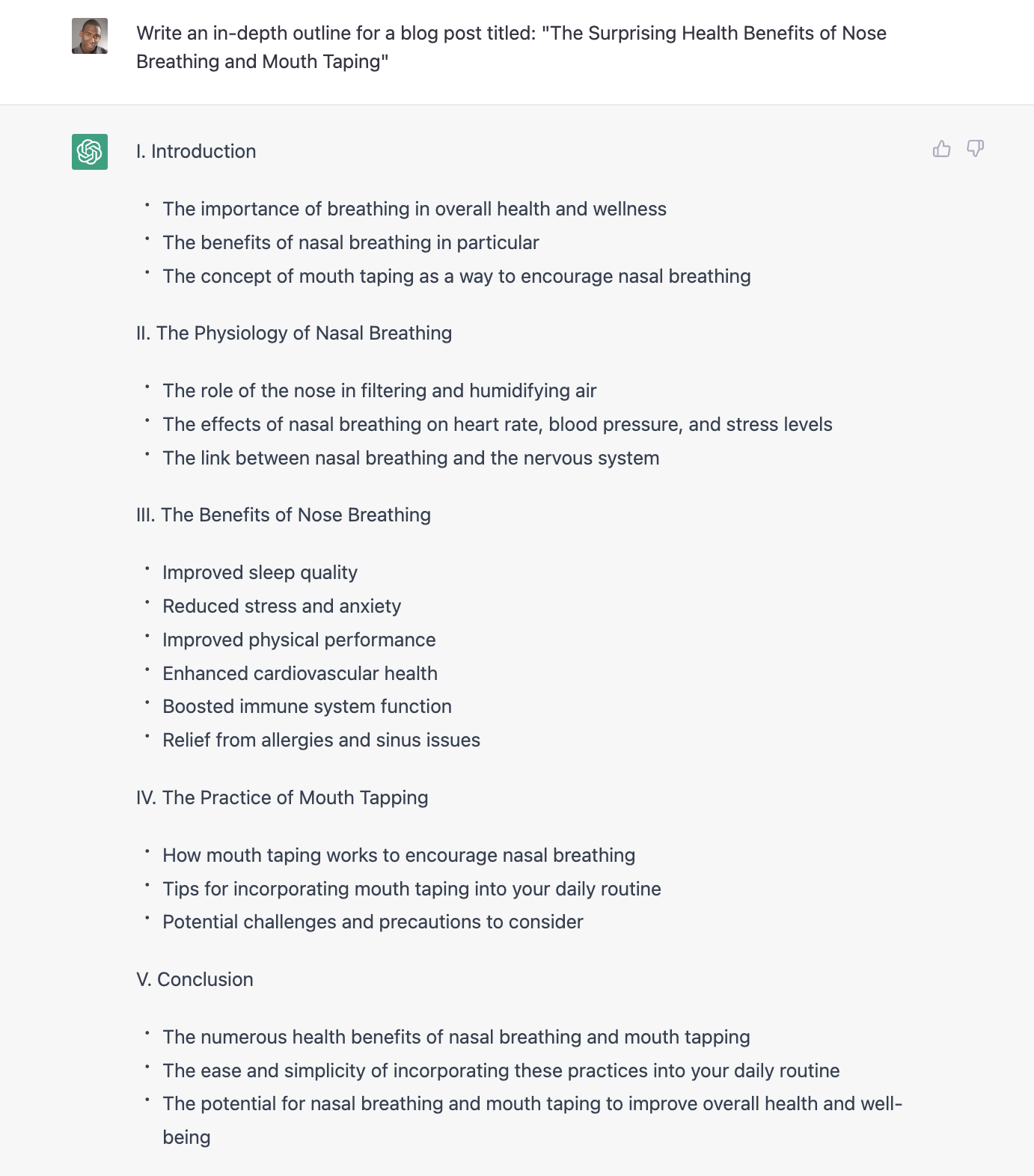 Dalam alur kerja pembuatan konten 1.0, langkah selanjutnya adalah mengidentifikasi judul dan mulai mengerjakan kerangka kerja yang menyusun karya tersebut. Dalam hal ini, jika kita menulis garis besar untuk judul "Manfaat Kesehatan yang Mengejutkan dari Pernapasan Hidung dan Plester Mulut" mungkin dibutuhkan penulis dan / atau peneliti di mana saja dari 1 – 2 jam untuk menyelesaikan tugas.