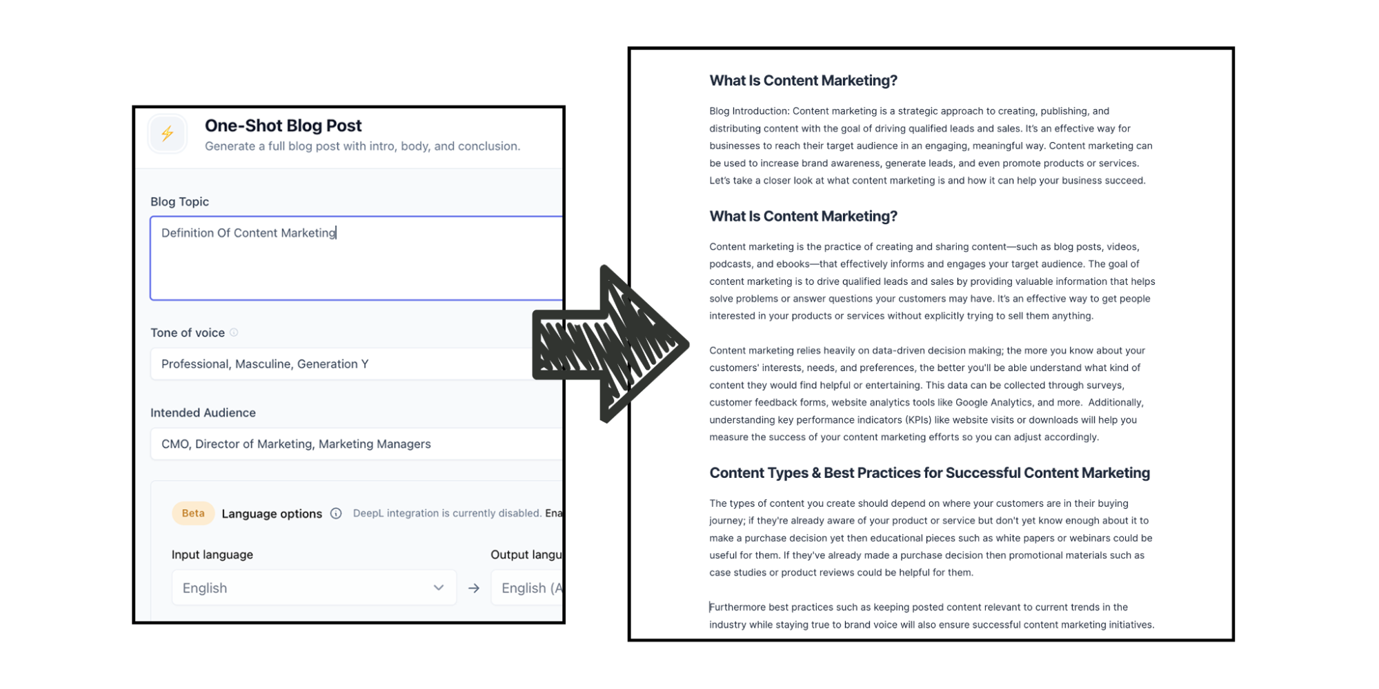 Dengan menggunakan Jasper , saya dapat mengambil setiap bagian dari "garis besar" yang disampaikan dalam Lembar Google Terpadu AI dan kemudian menempatkannya ke dalam Jasper untuk membuat postingan blog yang lebih mendalam. Dalam hal ini, saya cukup mengetikkan "Definisi Pemasaran Konten" ke dalam fitur Posting Blog One-Shot Jasper — dan dalam beberapa detik, saya memiliki perincian pemasaran konten yang mendalam: