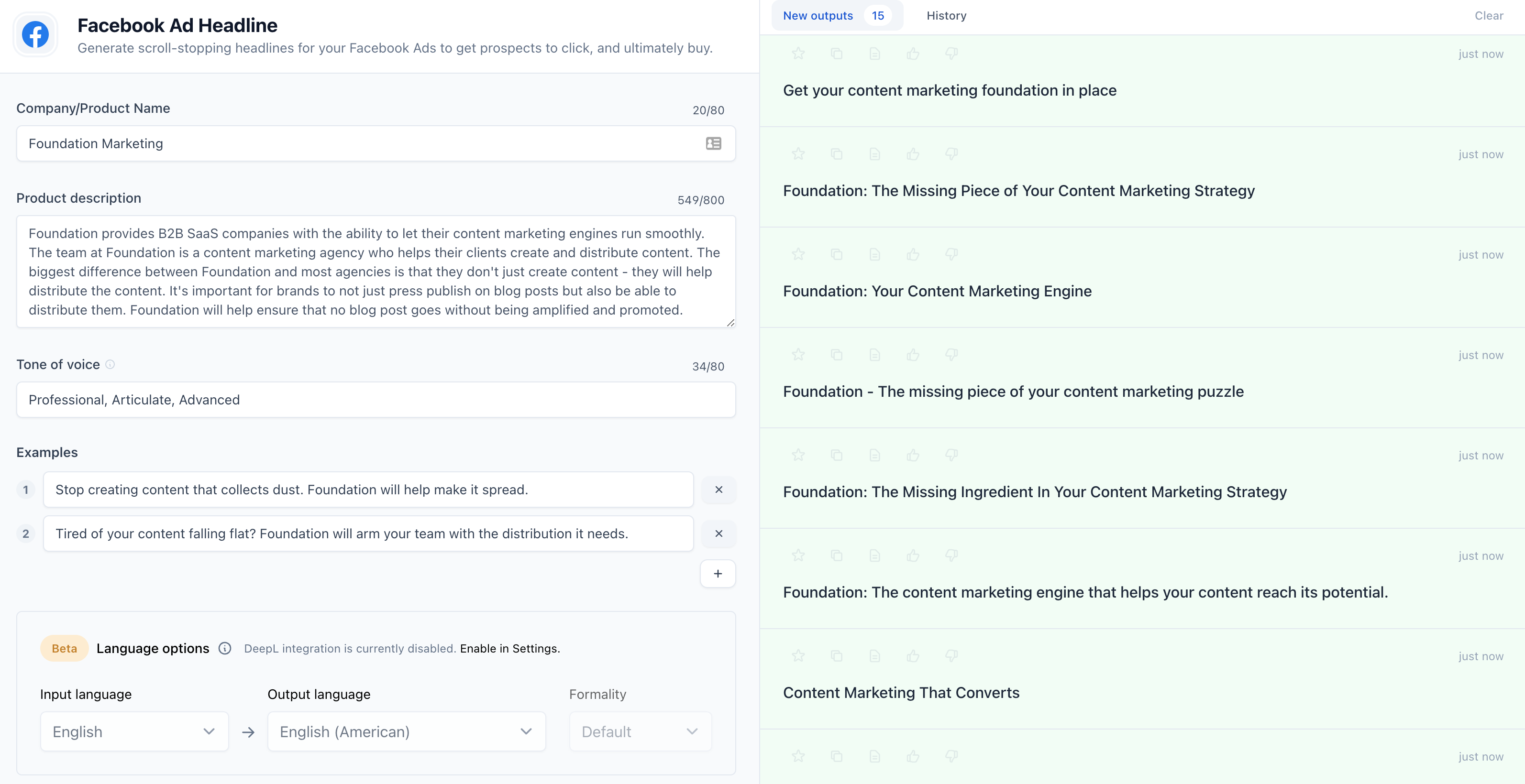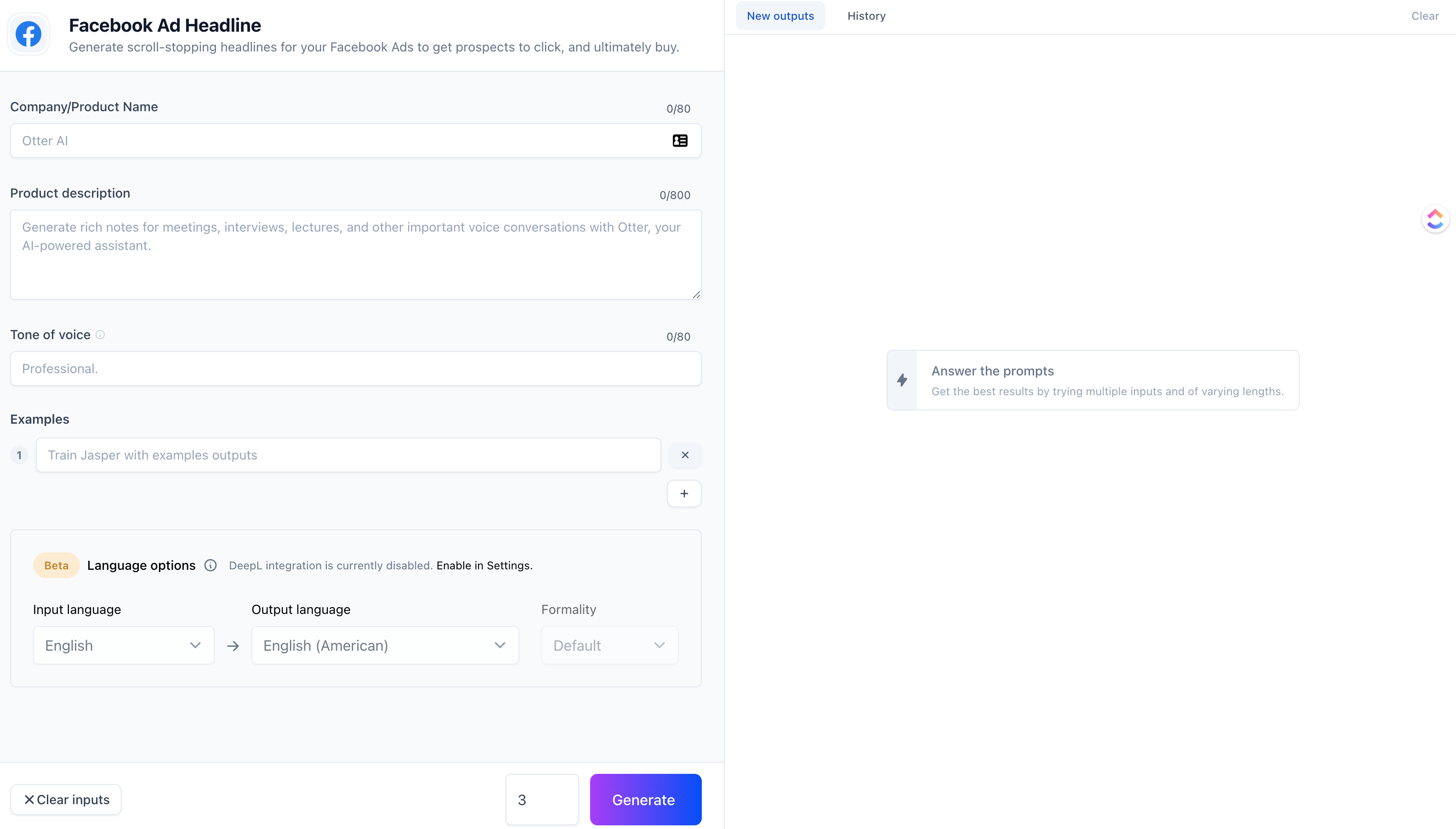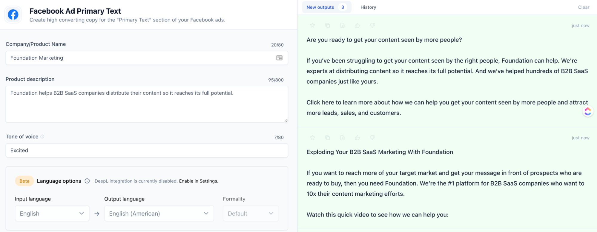 Saya kemudian dapat membuka bagian "Teks Utama Iklan Facebook" dari Jasper untuk membuat salinan iklan:
