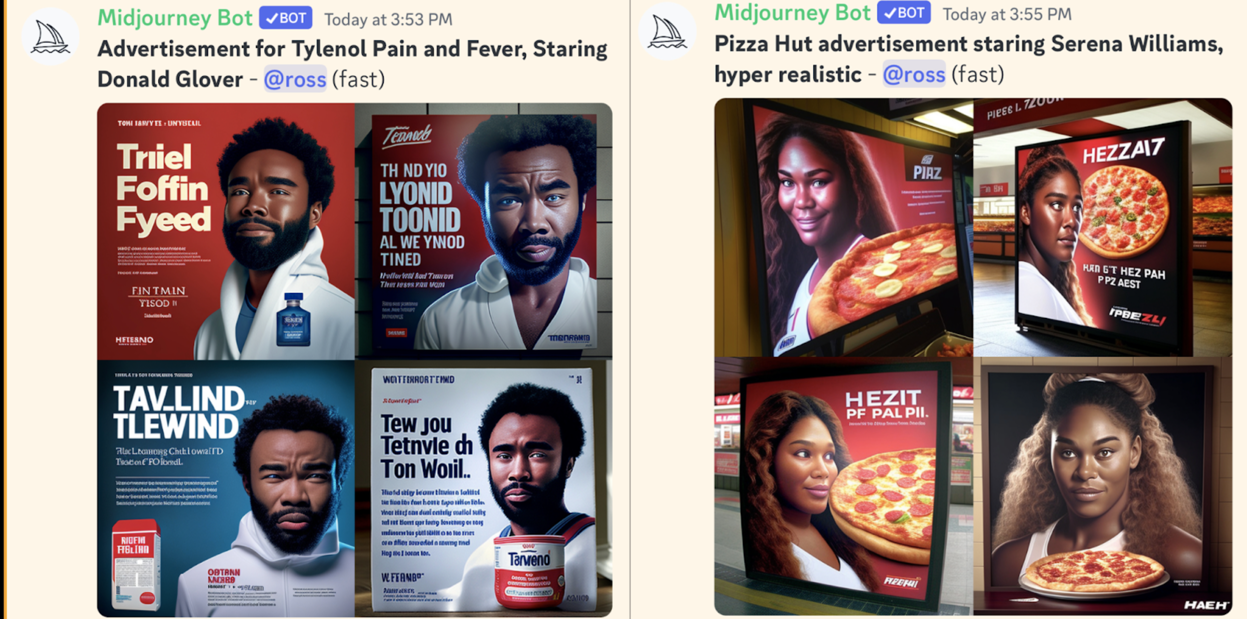 Kami belum sampai di sana, tetapi di masa mendatang, saya membayangkan sebuah dunia di mana kami dapat memberi tahu AI untuk membuat iklan (menggunakan perintah yang sangat deskriptif) dan sebagai tanggapan, dapatkan hasil yang persis seperti yang kami bayangkan. pikiran kita. Misalnya, saya meminta iklan Pizza Hut yang menampilkan Serena Williams, dan iklan Tylenol yang menampilkan Donald Glover.