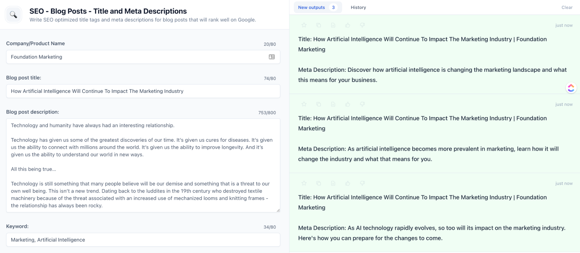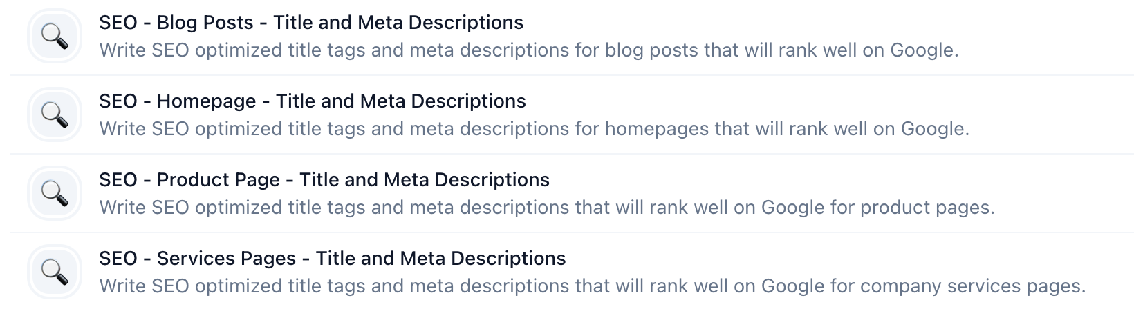 Salah satu tugas yang akan segera digantikan sepenuhnya oleh AI adalah penulisan deskripsi meta. Pemasar tidak lagi harus menghabiskan waktu menulis uraian singkat yang menggambarkan konten mereka — sebagai gantinya, alat seperti Jasper dan ChatGPT akan dapat melakukannya untuk mereka, dan lebih baik.