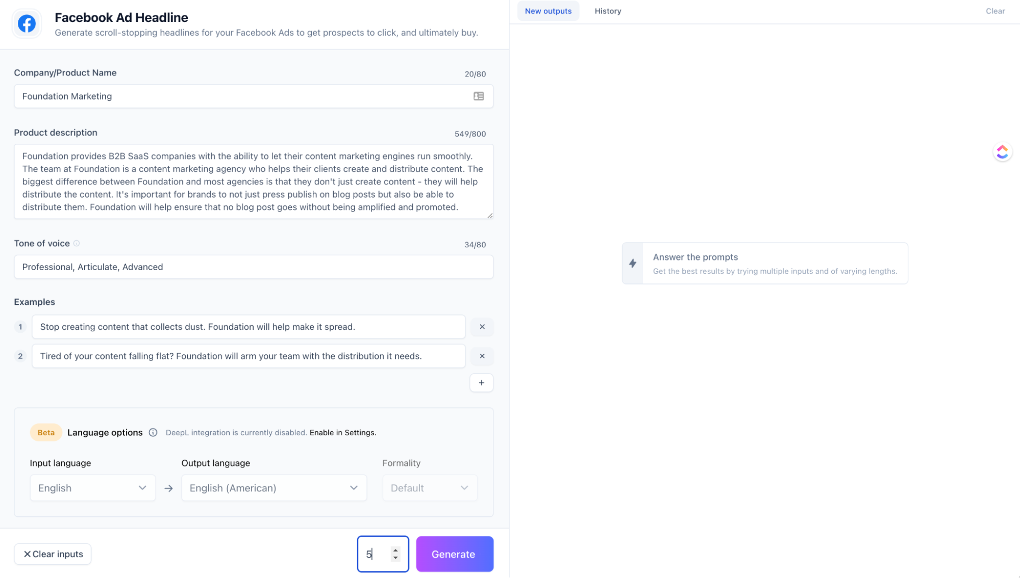 Di Alur Kerja Pembuatan Konten 1.0, langkah kedua dan ketiga diselesaikan secara manual. Langkah kedua dalam alur kerja pertama adalah tindakan mengidentifikasi (brainstorming) headline yang harus ditulis untuk blog berdasarkan kata kunci. Di masa mendatang, ini tidak diperlukan karena Anda dapat meminta alat AI untuk memberi Anda 5 berita utama berdasarkan kata kunci, dan mendapatkan berita utama tersebut dalam hitungan detik:
