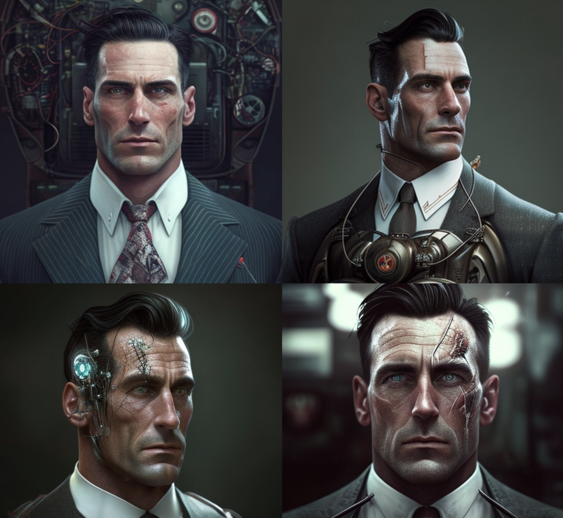 Yang harus saya lakukan hanyalah meminta MidJourney untuk membuat versi realistis dari Don Draper sebagai robot bagian atau cyborg, dan dalam hitungan detik, saya memiliki pilihan gambar untuk dipilih.