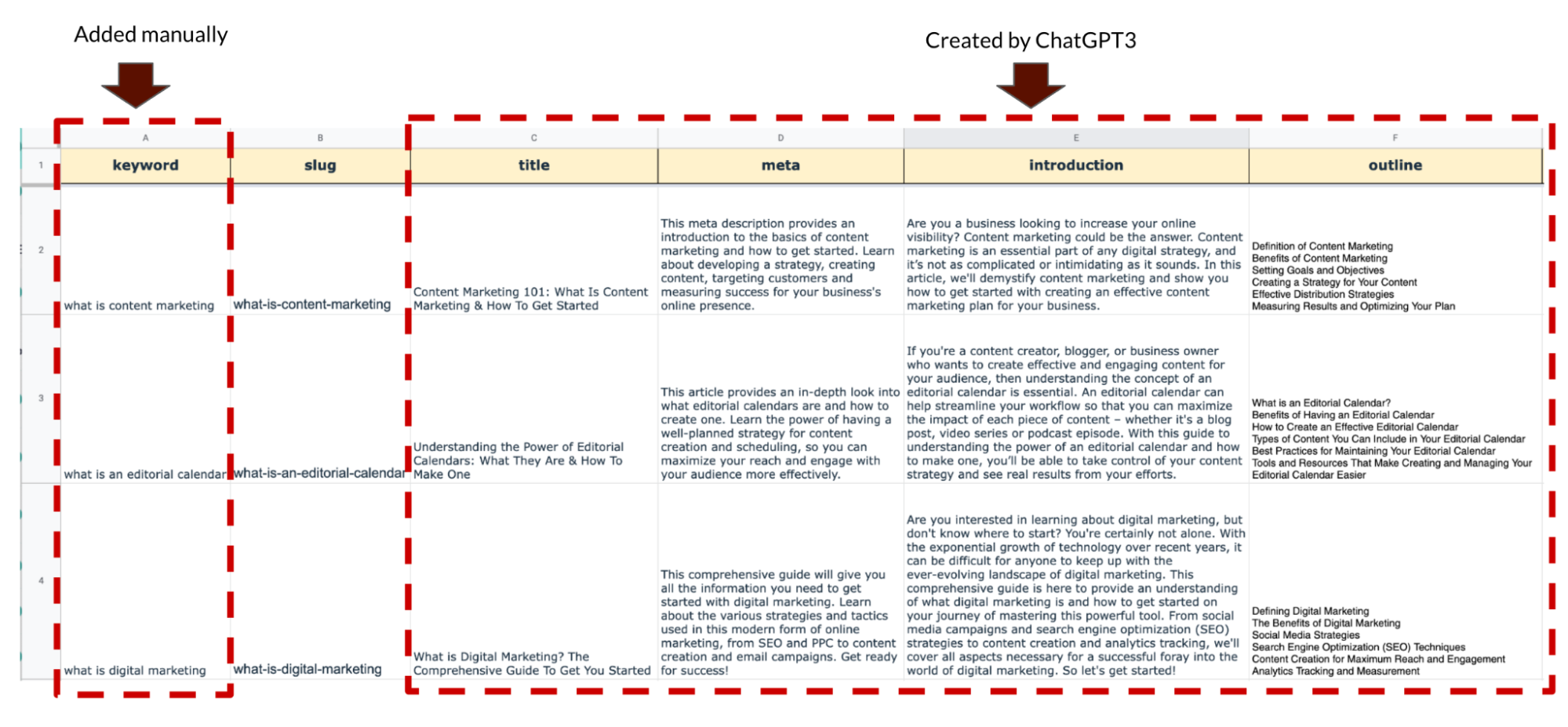 Sebagai contoh, saya ingin melihat apa yang dapat dilakukan Google Sheet , jadi saya memutuskan untuk membuat daftar beberapa kata kunci yang relevan dengan industri pemasaran. Katakanlah Foundation ingin membuat konten definisi tentang topik seperti pemasaran konten, kalender editorial, dan pemasaran digital untuk blog pemasaran. Saya cukup menambahkan kata kunci ini ke Google Sheet yang dikembangkan oleh Arielle Phoenix . Dan menggunakan API yang terhubung ke ChatGPT, itu memberikan judul, deskripsi meta, intro, garis besar, dan lainnya: